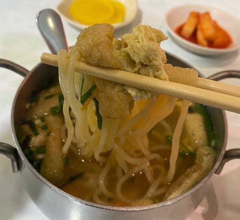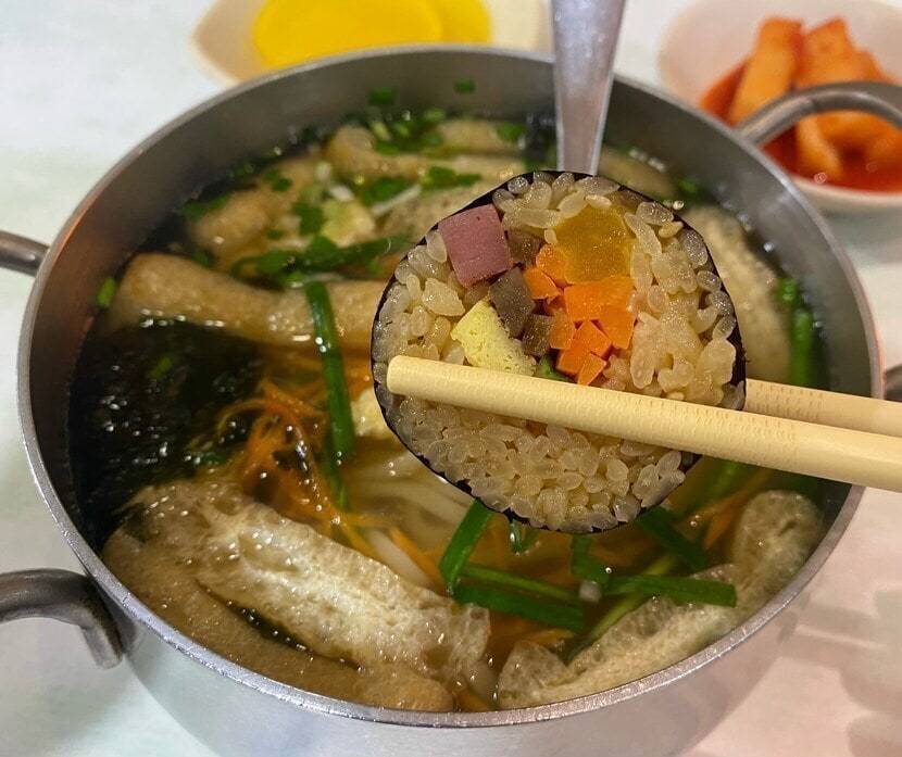 해장도 하고 배도 채울 겸 이연복 쉐프가 추천해서 더욱 유명해진 냄비국수와 김밥을 주문했습니다. 여기 냄비국수는 짜장면이나 짬뽕처럼 중화면을 사용하여 식감도 탱글탱글하고 쉽게 불지 않아요. ^^ 유부와 달걀찜 그리고 완당까지 속재료도 푸짐하여 맛과 양 모두 만족스럽습니다.