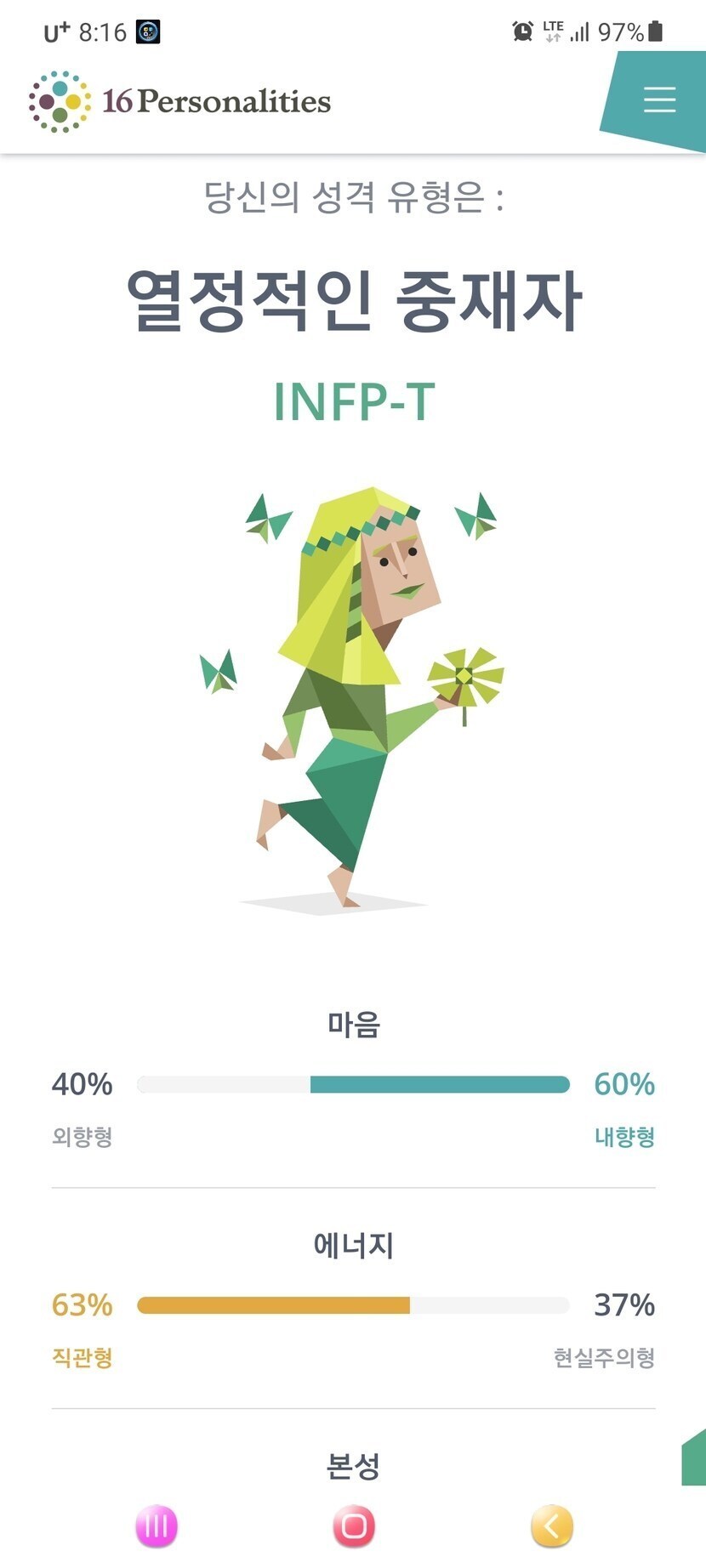 21.10.30 91 읽음 mbti는 잘 맞는걸까요? 안맞는걸까요? hcw209 구독하기 8 7 콘텐츠의 수익 2 mbti 인터넷에서 했는데 infp-t 가 나왔네요제가 그런지 잘모르겠는데 ㅋ 맞는거 같다는 사람이 많아요 ㅋ 어느정도 맞는거 같기도 하고요 ㅋ다른분들도 해보세요 재미로 보는거니깐요 ㅎ 7 0 / 300 입력