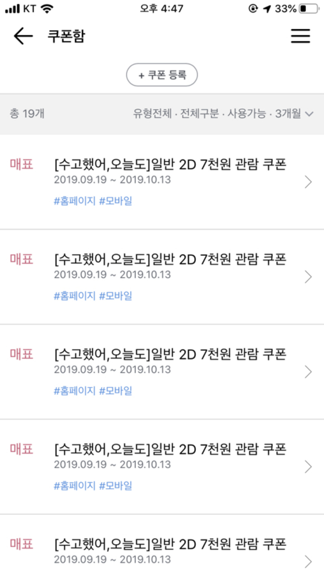19.09.20 635 읽음 CGV 7천원관람쿠폰번호 마이구미복숭아맛 구독하기 1 1 콘텐츠의 수익 0 CGV앱 - MY - 쿠폰등록 -번호기입 끝!쿠폰 하나당 동반1인까지 가능하대 ㅎ3033753~3033770까지 하나씩 넣어봐 !!3033759,3033760이렇게 !! 그럼 7천원 쿠폰 준다!!중간에 안 될 수도 있어 ! 나 그렇게 19개 다운 받았어 ㅎㅎ문제시 , 말투 둥글게 해줘 ㅎㅎ! 1 0 / 300 입력