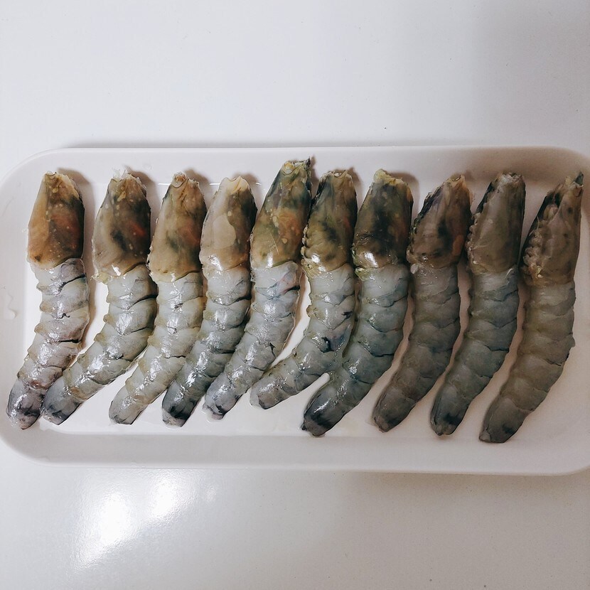 새우 손질은 새우 머리뿔이랑 수염, 꼬리의 물총만 떼고 가운데 잘라서 내장 제거만 하면 기본 손질은 끝납니다