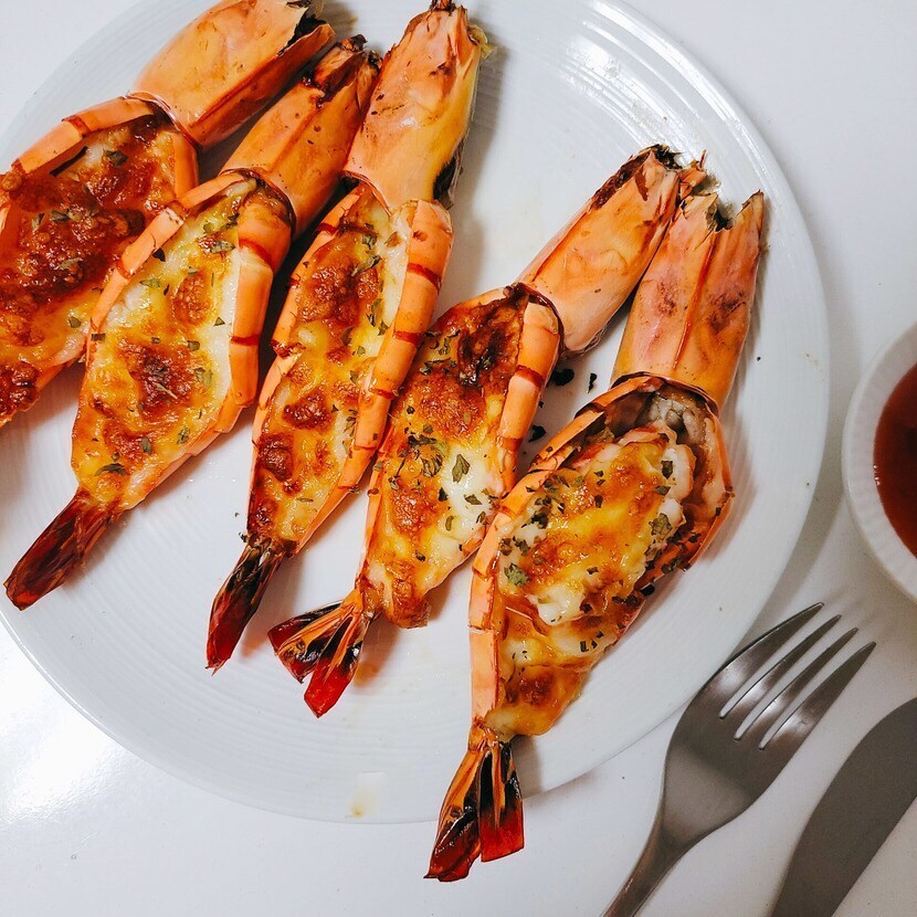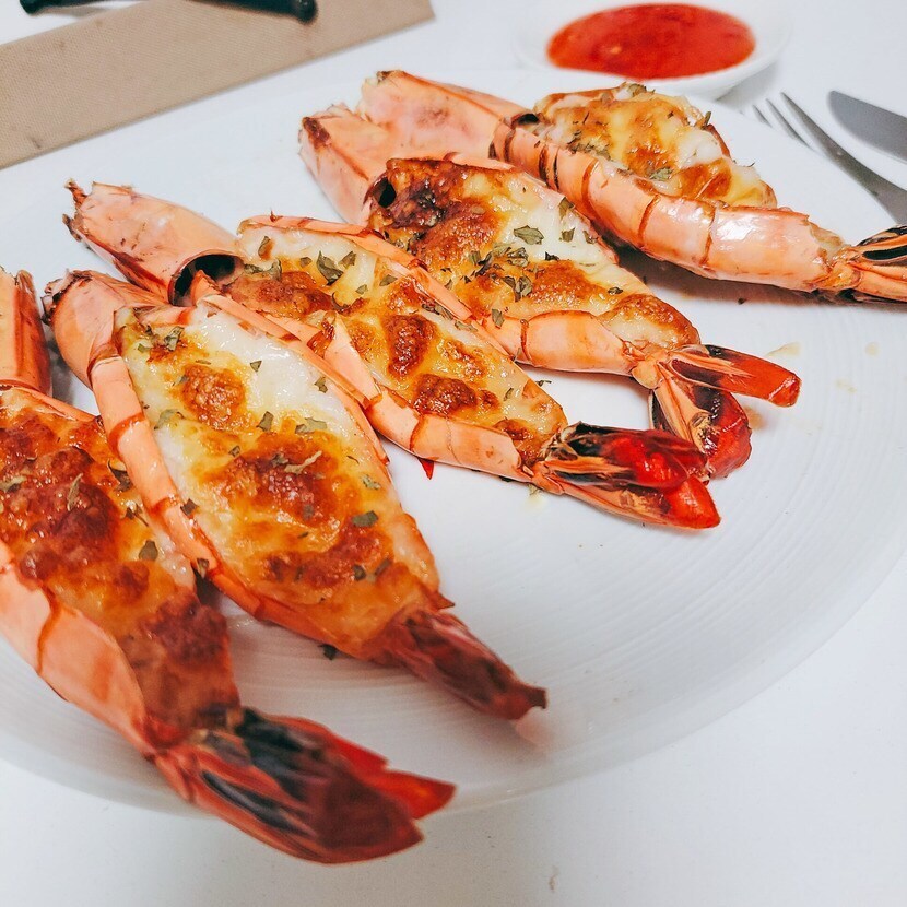 요건 구울 때 새우 껍질을 남겨놓은 상태에서 반으로 가른 뒤 버터 바르고 치즈 올려 에어프라이어에 구워요