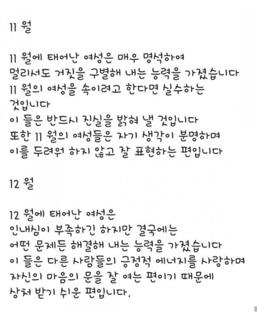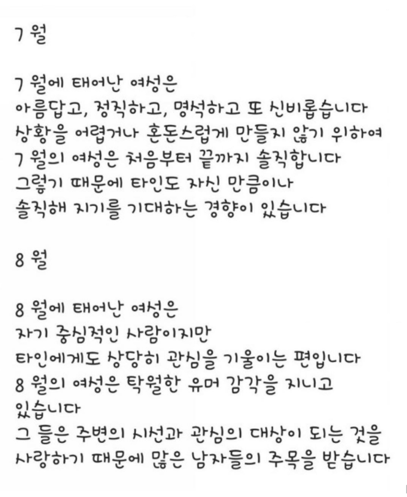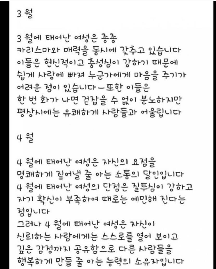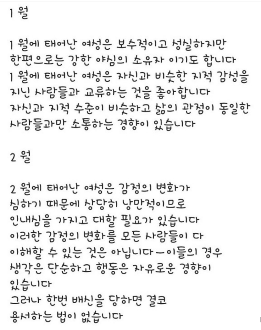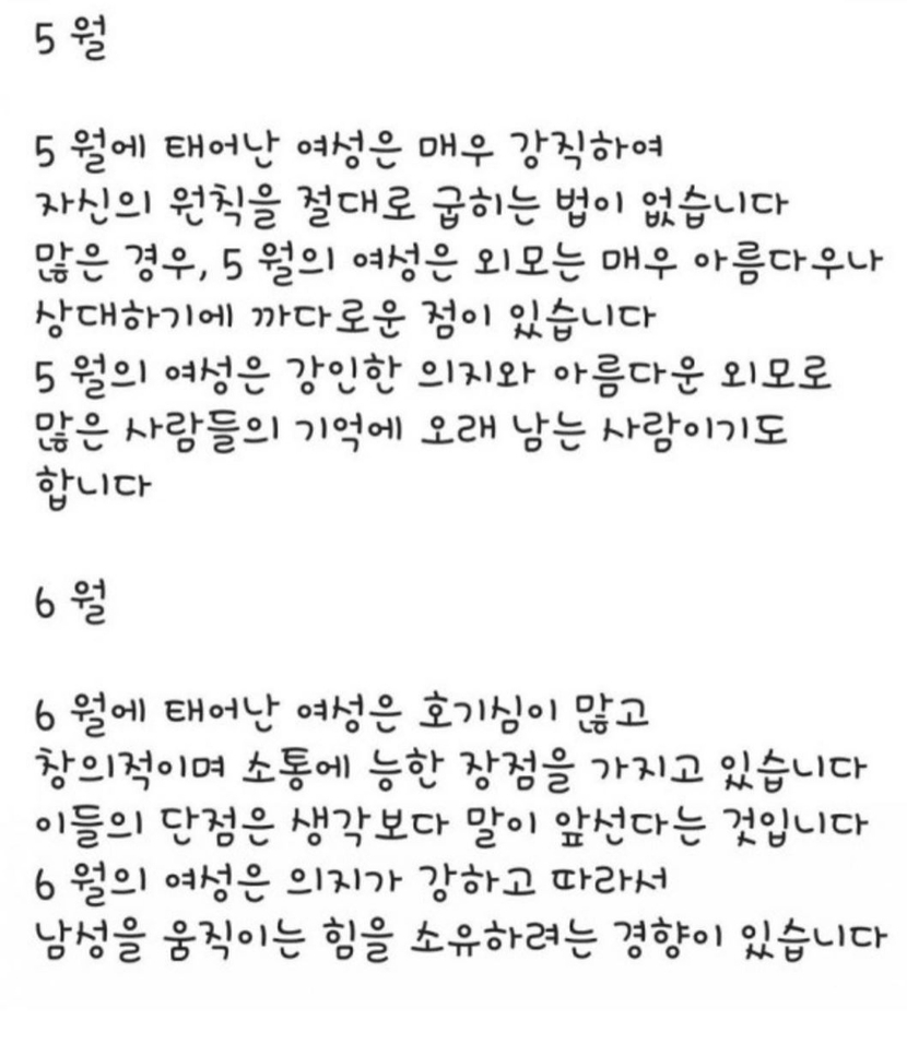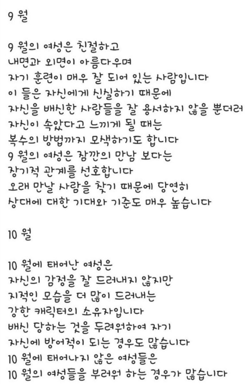 20.01.28 119 읽음 생년월로 파악하는 여자성격 알아볼까요~ 하루온종일 구독하기 4 11 콘텐츠의 수익 13 생년월별로 성격 테스트 해보세요제가 보기엔 어는정도 맞는것 같은데~^^ 11 0 / 300 입력