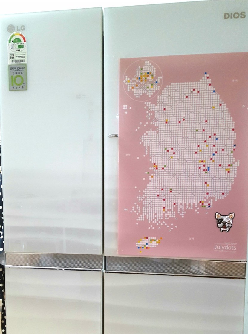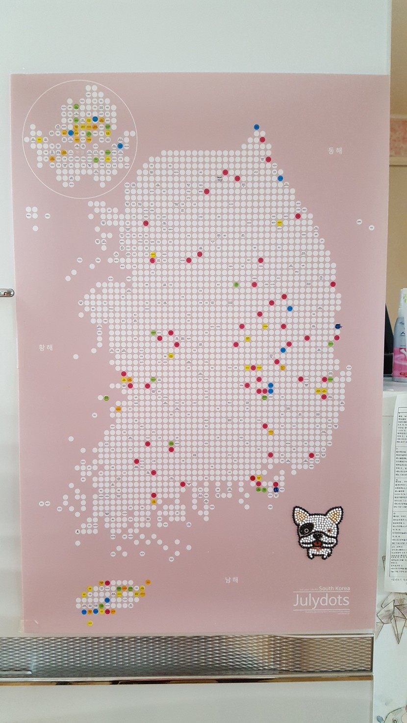 몇 해 전 친구들과 배송비 절약을 위해 공동구매한 줄리아닷츠 한국지도입니다~ 여행 다녀온 곳을 스티커를 붙여 기록을 남겨요~ 우리 가족은 각자 다녀온 곳은 제외하고 함께 간 곳만 스티커를 붙입니다.우리 가족은 시,군 명칭은 빨간색 스티커를, 나머지는 자유롭게 붙입니다. 어떤 분들은 가고 싶은 곳과 갔던 곳을 구분해서 스티커를 붙이기도 하고, 함께 간 사람이 누구인지에 따라 색을 구분해서 붙이기도 하시더라구요. 가족, 연인, 친구, 직장동료 등^^ 여러 방법으로 활용 가능합니닷~ 냉장고 문에 붙여뒀어요. 냉장고가 조금 밋밋한 디자인인데 여행지도 도트맵으로 조금 생기 있게 변했어요^^ 아이들도 여행 다녀와서 스티커 붙이며 지역 위치도 알아보고, 냉장고 문 여닫을 때마다 여행 기억을 떠올리기도 합니다.