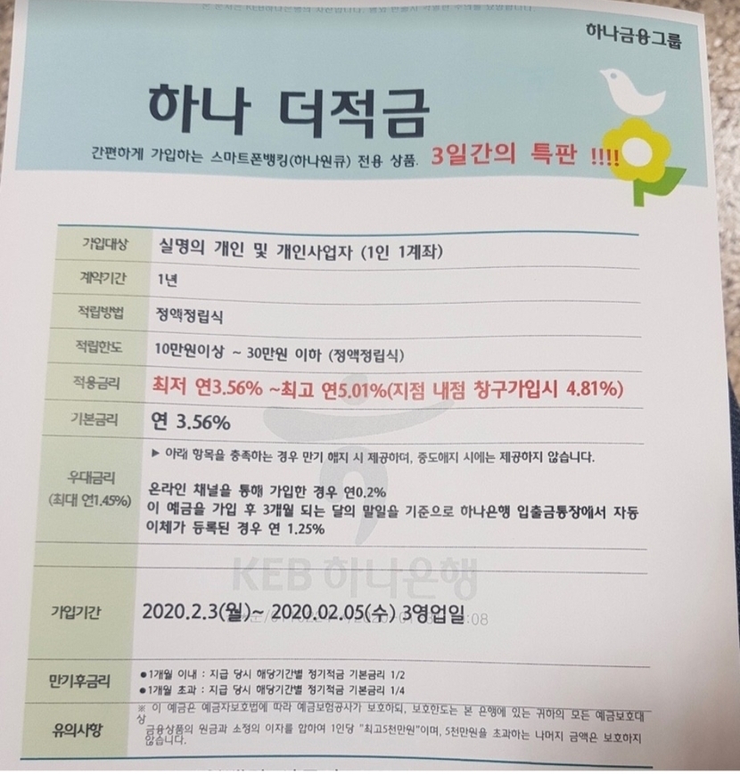 20.02.02 345 읽음 하나적금5.01%주네요 PT제리 구독하기 2 33 콘텐츠의 수익 53 내일부터3일간하나적금5.01%받을수있는적금개시하네요저는주거래은행이하나라서준비중입니다1년이긴해도요즘금리낮은데괜찮은거같아요그리고하나뱅킹에매일포춘쿠키여는거있어서혹시하나은행고객이시면열어보라고같이올립니다^^ 33 0 / 300 입력