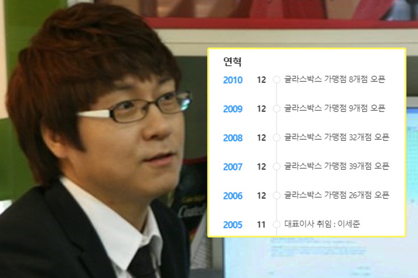 2005년 글라스박스는 강남역 1호점이 전부였지만, 11월부터 본격적인 프랜차이즈화에 나서게 됩니다. 이후 그의 프랜차이즈는 2006년 26개 점을 오픈하고 2007년 39개, 2008년 32개 점을 오픈하는 데 성공합니다. 다만 2009년부터는 두 자리 미만으로 신규 가맹점이 줄어들었죠.[the_ad id="537"]