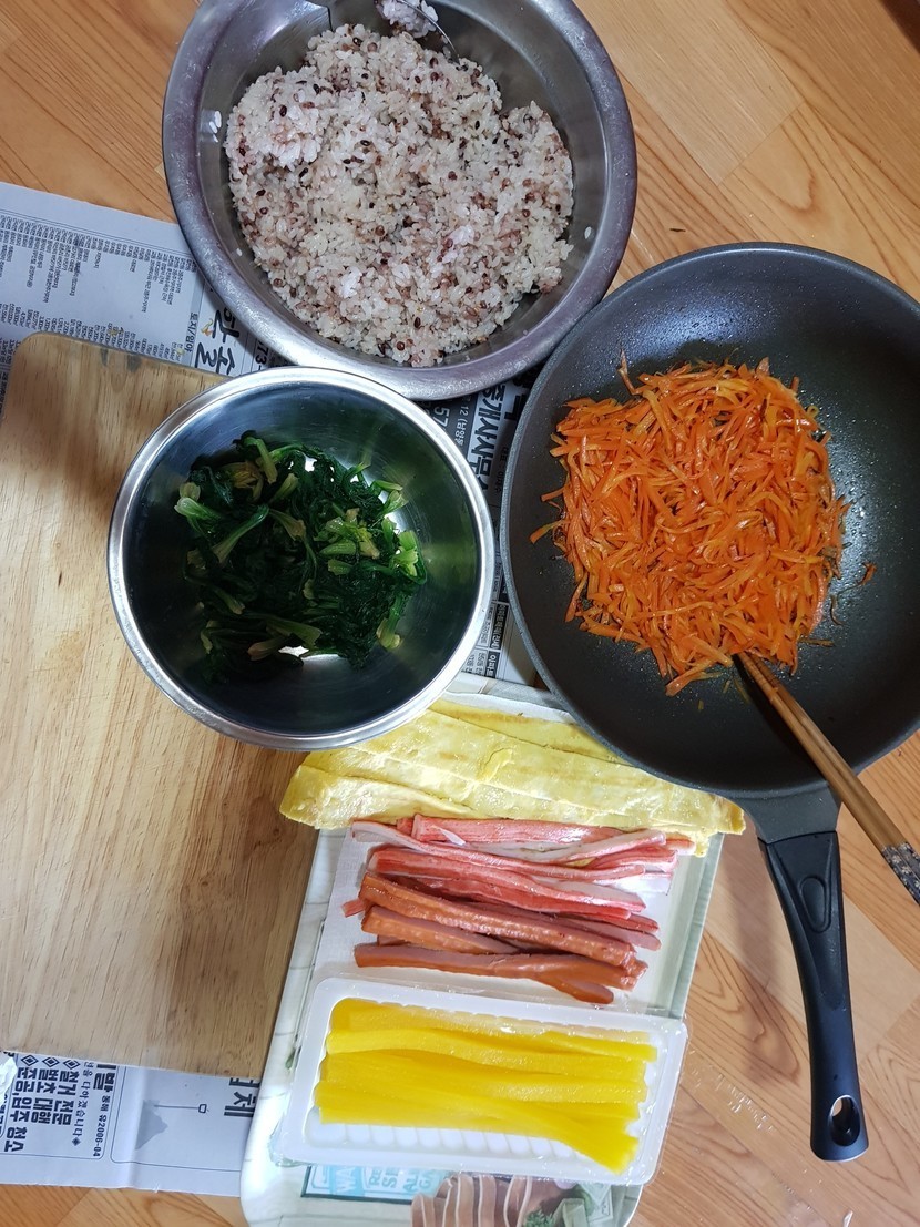 20.02.02 122 읽음 일요일엔 김밥이죠 jhlee6303 구독하기 2 7 콘텐츠의 수익 19 김밥, 재료는 이렇게 준비했어요!당근은 볶아서 많이 넣어주면 맛있어요!계란은 얇게 지단을 만들어 여러장 썰어 넣으면 더 맛있는데, 귀찮아서 그냥 두껍게 했네요!맛있는 김밥으로 스트레스 날려버려요~ 7 0 / 300 입력