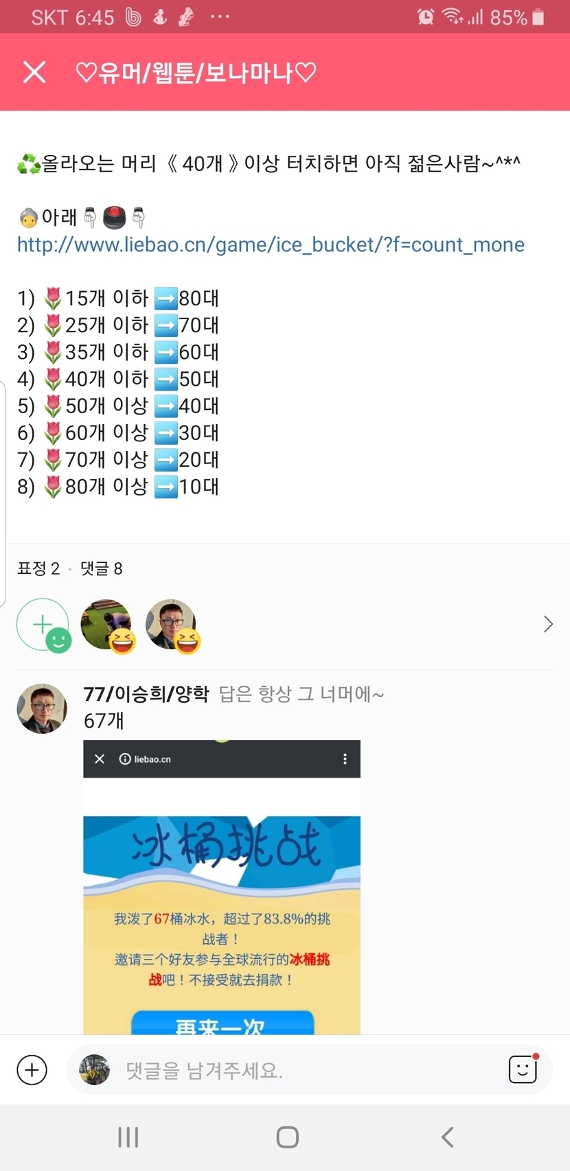 20.02.08 165 읽음 치매 예방 및 진단^^ 즐거운인생.산이조아 구독하기 0 21 콘텐츠의 수익 28 http://www.liebao.cn/game/ice_bucket2/?f=ice_bucket 21 0 / 300 입력