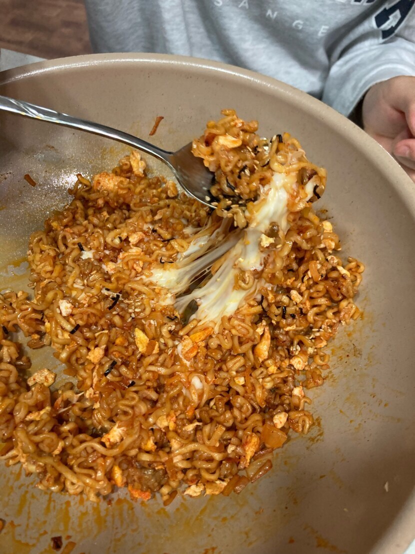 22.02.09 276 읽음 불닭볶음밥.. 아시나요?? 지금이 최선입니까! 구독하기 35 29 콘텐츠의 수익 9 불닭볶음밥이랍니다. 큰딸이 어디서 봤는지 먹고싶다고 해서 해줬어요. 면을 삶고 잘게 잘라서 햄이랑 소스 넣고 밥이랑 볶은 후 치즈 올려 먹는다고 하더군요. 햄은 없어서 패스하고 치즈도 네모 치즈라는데 없어서 모짜렐라 치즈 넣고 뚜껑 덮어서 살짝 데웠어요. 그리고 버터 한 조각…불닭볶음면 너무 매워 많이 못 먹는데 이렇게 먹으면 먹을만 하네요. 특식으로 강추해 봅니다. 29 0 / 300 입력