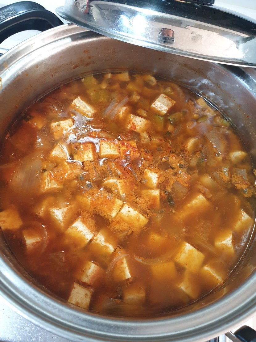 지난번 만들어놓은 푸팟퐁커리 마파두부 호박죽 등등 남았구요.
