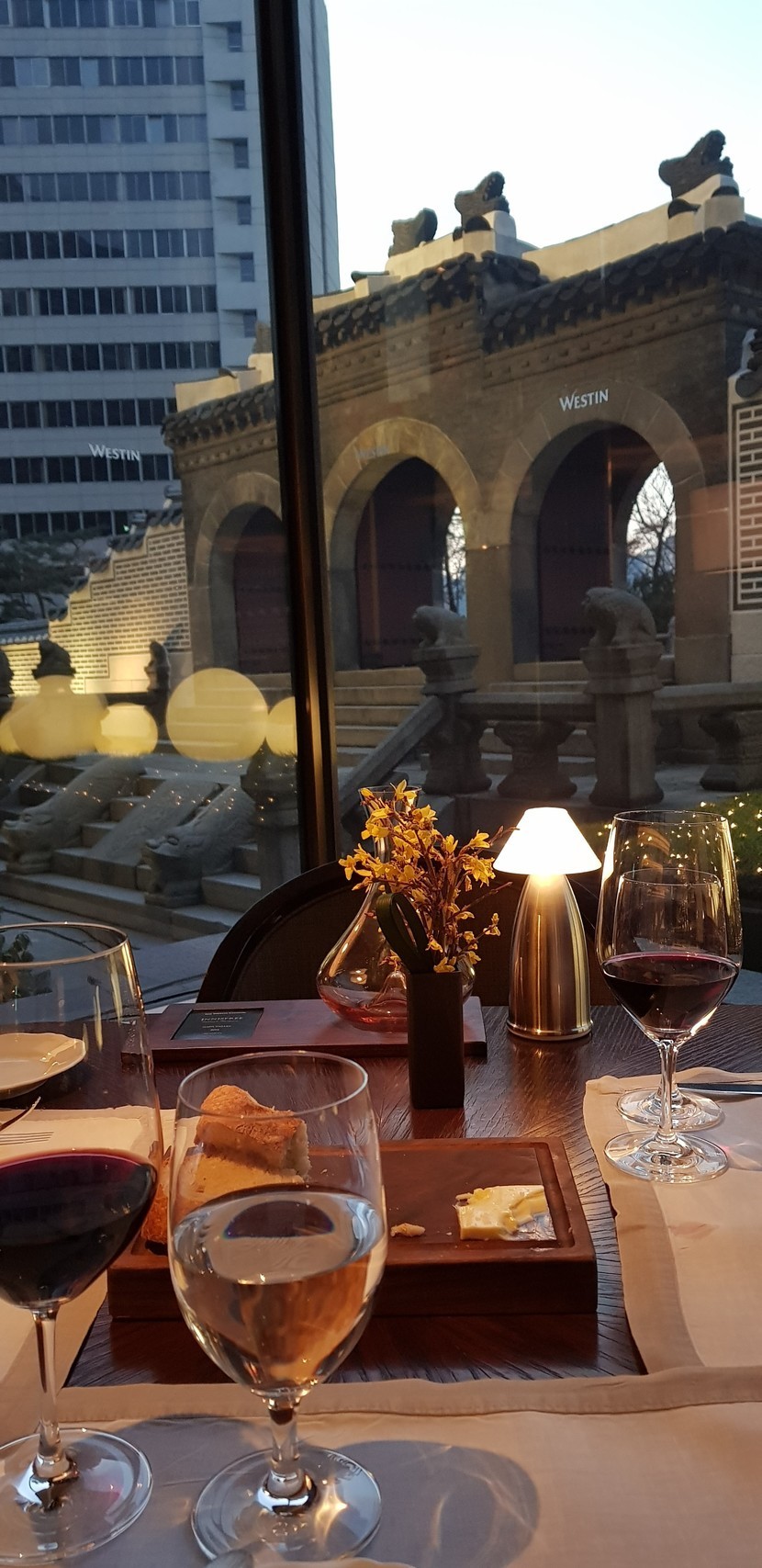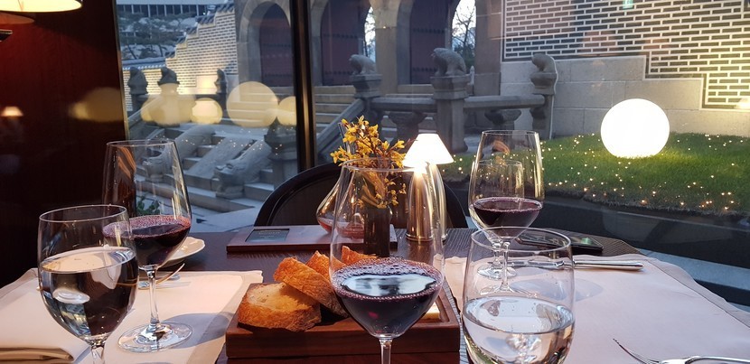 친구들과 웨스틴조선호텔에 있는 나인트게이트 식사를 했습니다. 가격 주말 디너 95,000원 십만원대 후반가격으로 보고 갔었는데 주말에는 더 저렴하게 먹을수 있는것 같아요.예약 늦게 했는데 다행히도 창가자리 겟 했습니다.환구단이 조금이나마 보이는 자리가격이 생각보다? 괜찮아서 와인도 추천받아 주문했네요. 이름모름 글라스와인 각 2만원식전빵이 쫄깃하구 맛있어요.요건 캐비어올린 참치타르타르그뤼에르 치즈를 올린 양파스프요건 주방장추천스픈데 그날은 단호박이 괜찮다고해서 친구가 시켰어요푸아그라드레싱을 올린 시저샐러드친구거 단호박튀김 올린 시금치 샐러드메인메뉴 등심 스테이크,계절채소,감자 퓌레초콜릿 무스케이크와 바닐라 아이스크림먹고 디저트가 달아서 페퍼민트로 입가심.
