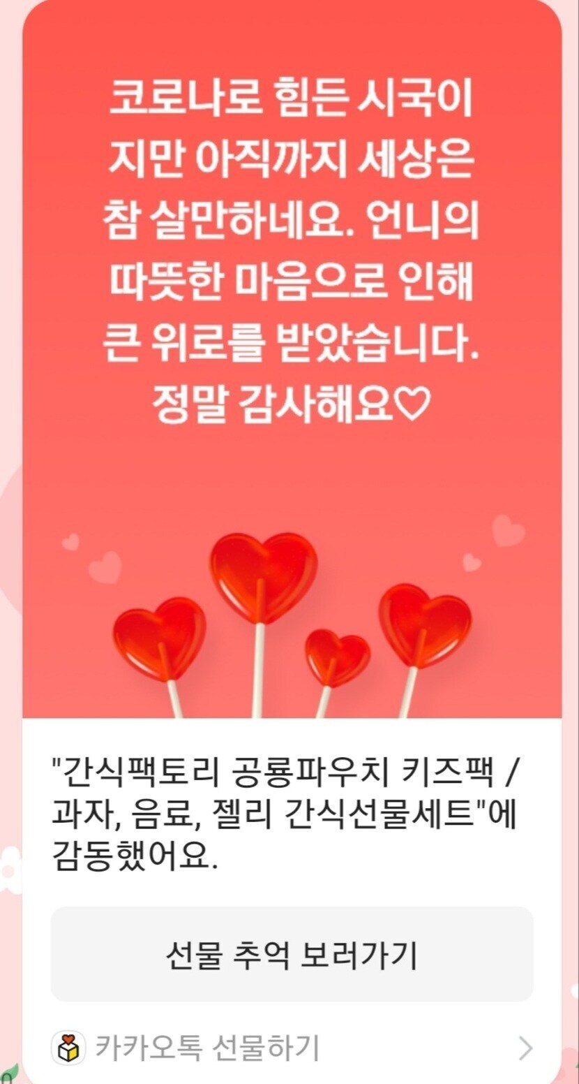 미안하다며 아이들에게 먹이라고 과자 선물을 보내주셨어요.