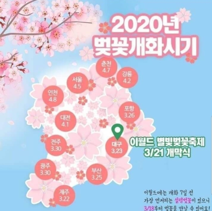 20.02.13 235 읽음 ☆전국 벚꽃 개화시기☆ 2509 구독하기 0 15 콘텐츠의 수익 16 이월드 에서 알려주는2020년 벚꽃 개화시기대구는 3월 23일🌸꽃놀이 갑시다!!! 15 0 / 300 입력