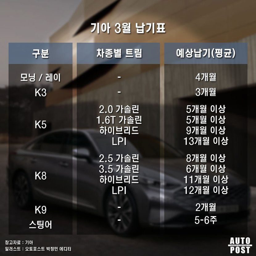 차종별로 납기 기간을 살펴보면 모닝과 레이는 출고까지 4개월 소요되고 내비게이션을 적용하지 않으면 1.5개월로 짧아진다. K3는 3개월, k5는 5개월에서 9개월 이상 걸리고 LPG 모델 같은 경우 13개월이나 대기해야 한다. K8도 역시 대기기간이 만만치 않았다. K8 가솔린 모델은 6개월에서 8개월, 하이브리드는 11개월 이상, LPG 모델은 12개월 대기해야 한다.