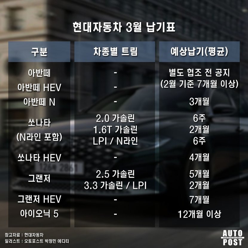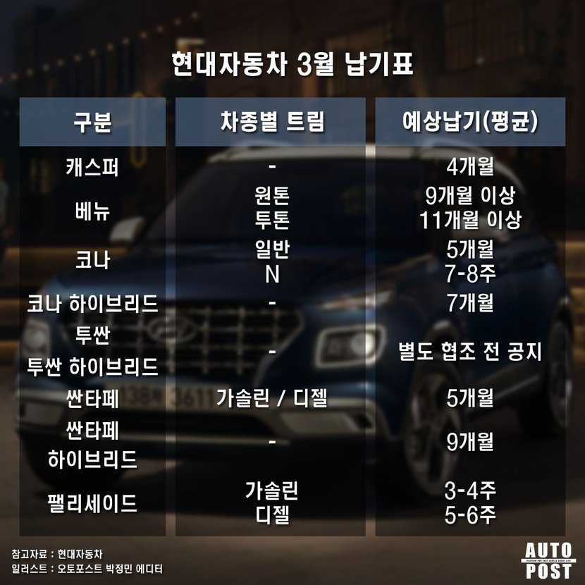 실제로 현대차와 기아의 예상 평균 납기표를 잠깐 살펴보니 3월 출고 대기기간이 2월보다 훨씬 더 길어졌다. 도대체 요새 차량 출고 대기기간이 얼마나 긴 것일까? 오늘은 현대자동차와 기아의 차량 마다 출고 대기 기간에 대해서 살펴보려고 한다.