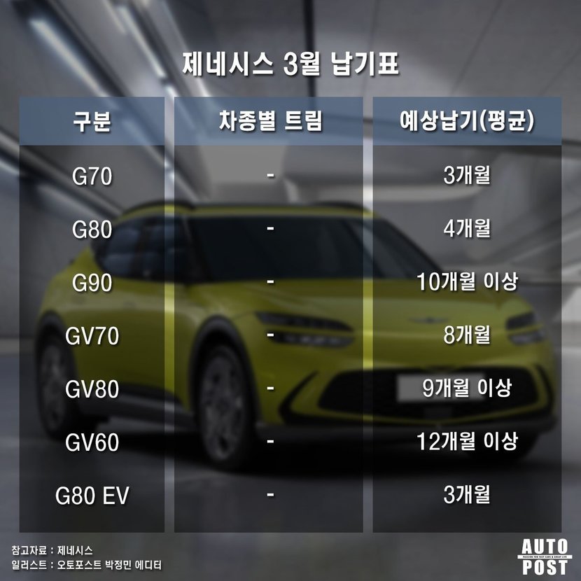 올해 초 출시된 판매 가격이 1억 원이 훌쩍 넘는 차인 제네시스 G90은 첨단 기능들이 대거 탑재되어 있는 만큼 차량용 반도체가 많이 쓰이기 때문에 제네시스 내연기관차 모델 중에서 가장 대기 기간이 길었다. G90의 출고 대기기간은 10개월 이상 걸릴 것으로 보인다. 여기에 추가로 제네시스 전기차들의 출고 기간을 살펴보면 GV60은 1년 이상 걸리지만 G80 EV는 3개월로 비교적 짧은 출고 대기 기간을 가졌다.