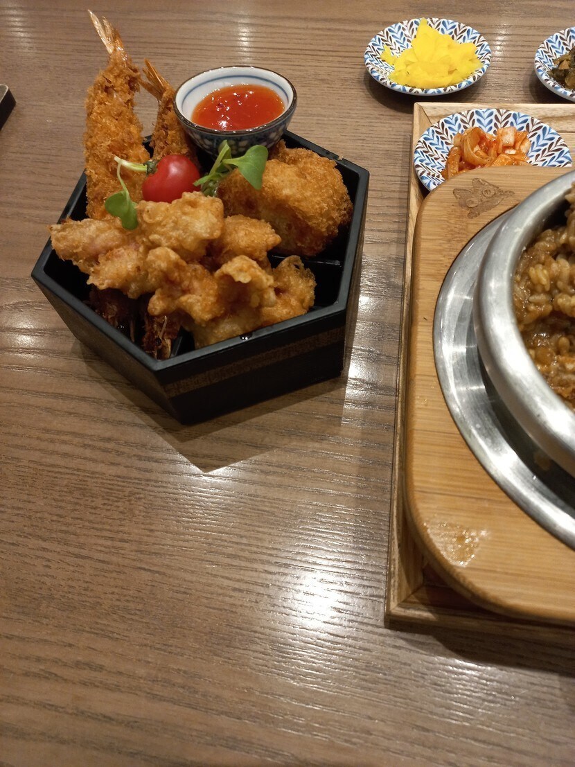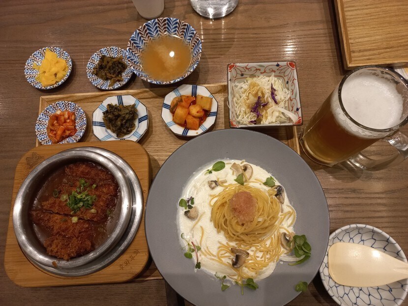 신도림 현대백화점 후와후와. 돈카츠커리솥밥, 명란크림파스타, 후와후와플래터. 그리고 생맥주. 50% 할인쿠폰 생겨서 간만에 일식. 20700원. 가격 짱. 돈카츠는 야들야들 쫄깃한 돼지고기 등심인 듯. 카레랑 잘 어울렸어요. 명란크림파스타는 크림파스타의 느끼함과 명란의 짭쪼롬함이 매혹적으로 합체. 플래터는 바삭한 새우튀김이랑 감자고로케, 치킨가라아게 세 가지로 구성. 바삭한 튀김. 생맥주랑 잘 어울렸네요. 일식은 아기자기한 재미가 있어요. 우와 배불러. 이 많은 걸 쌀알 조금 남기고 다 먹었으니. 쿠폰은 정말 신의 부름같아요. 잘만 활용하면, 노리고 있던 데 적용하고 괜히 지르지만 않는다면.