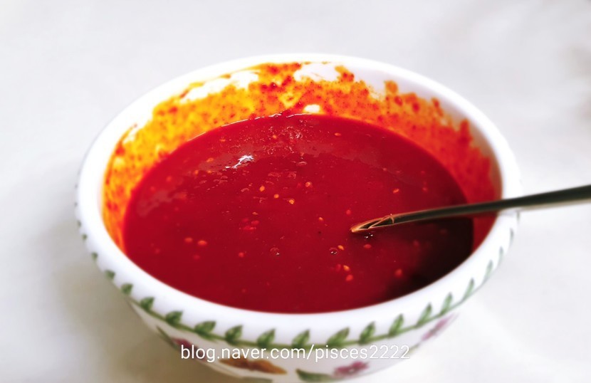고추장 2큰술, 고춧가루 2큰술, 다진마늘 1큰술, 매실엑기스 1큰술, 올리고당 1큰술, 식초 4큰술, 진간장1큰술, 참기름1 큰술, 통깨 1/2큰술, 후춧가루 약간