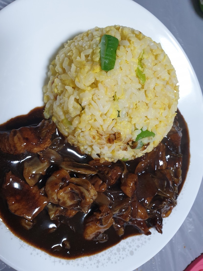 8. 볶음밥이 완성되면 만들어놓은 짜장을 얹어서 먹으면 됩니다