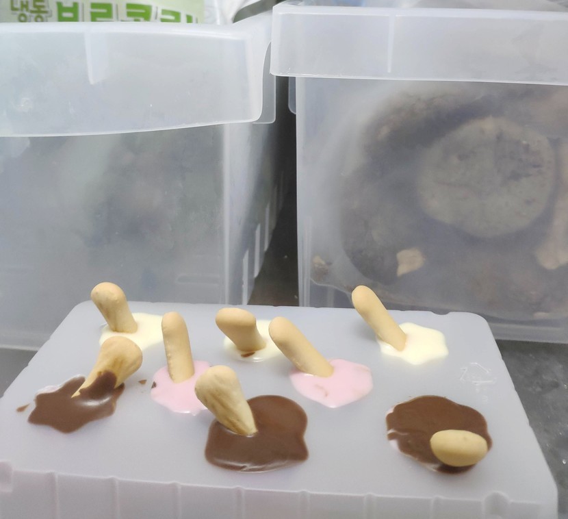 남은 과자에 튜브에 있는 초콜렛을 싹썩 긁어서