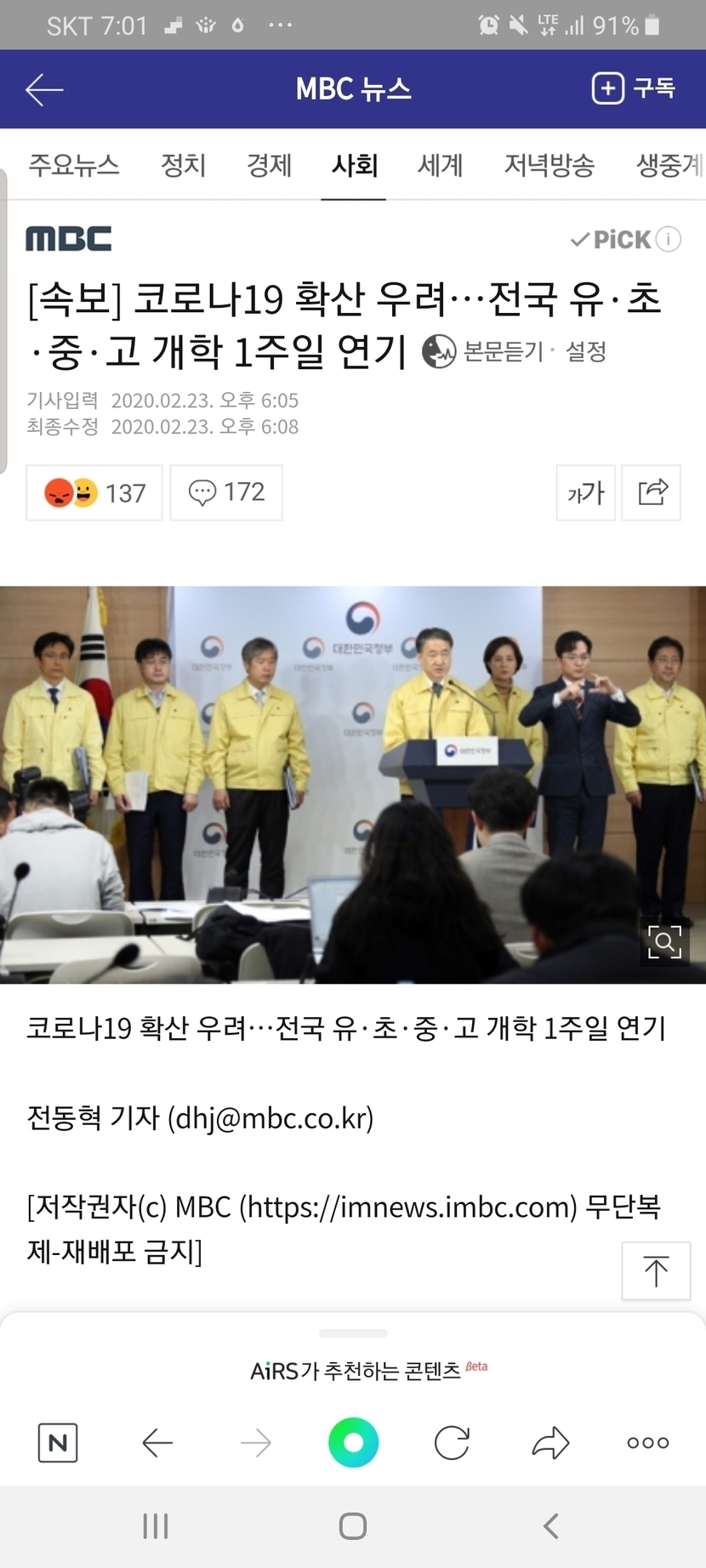 코로나로 전국 유.초.중.고 개학 일주일 연기!
