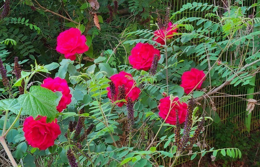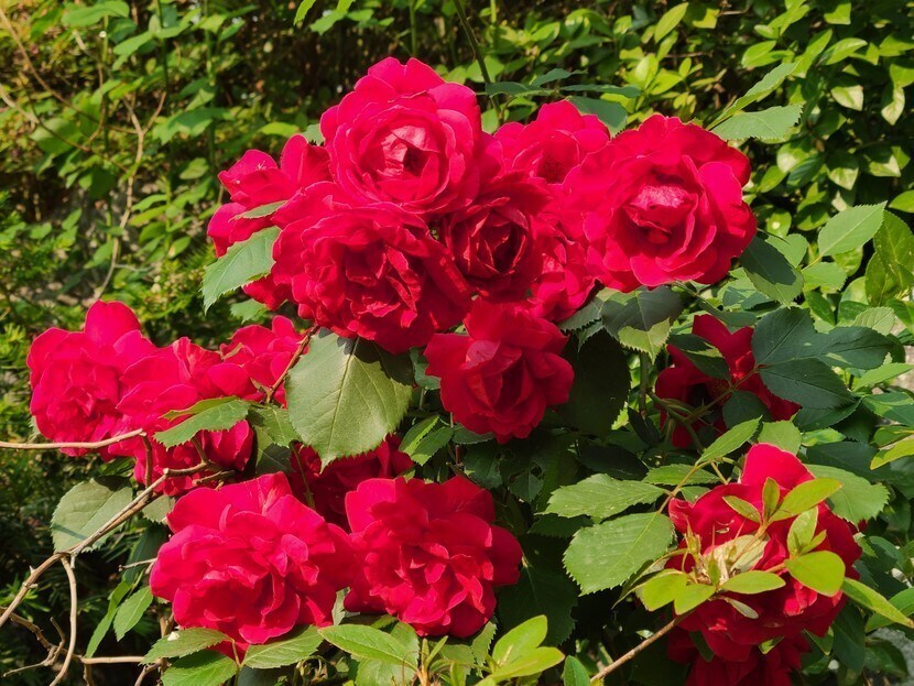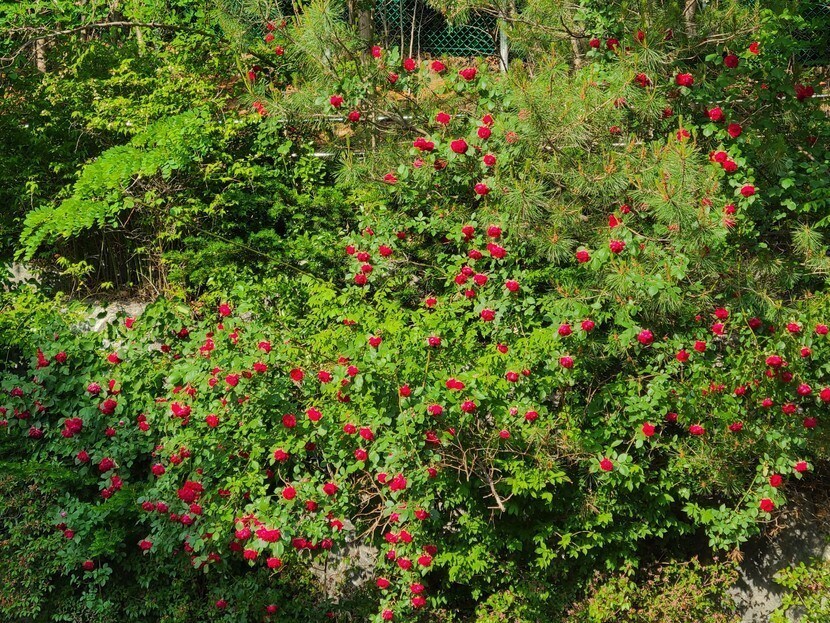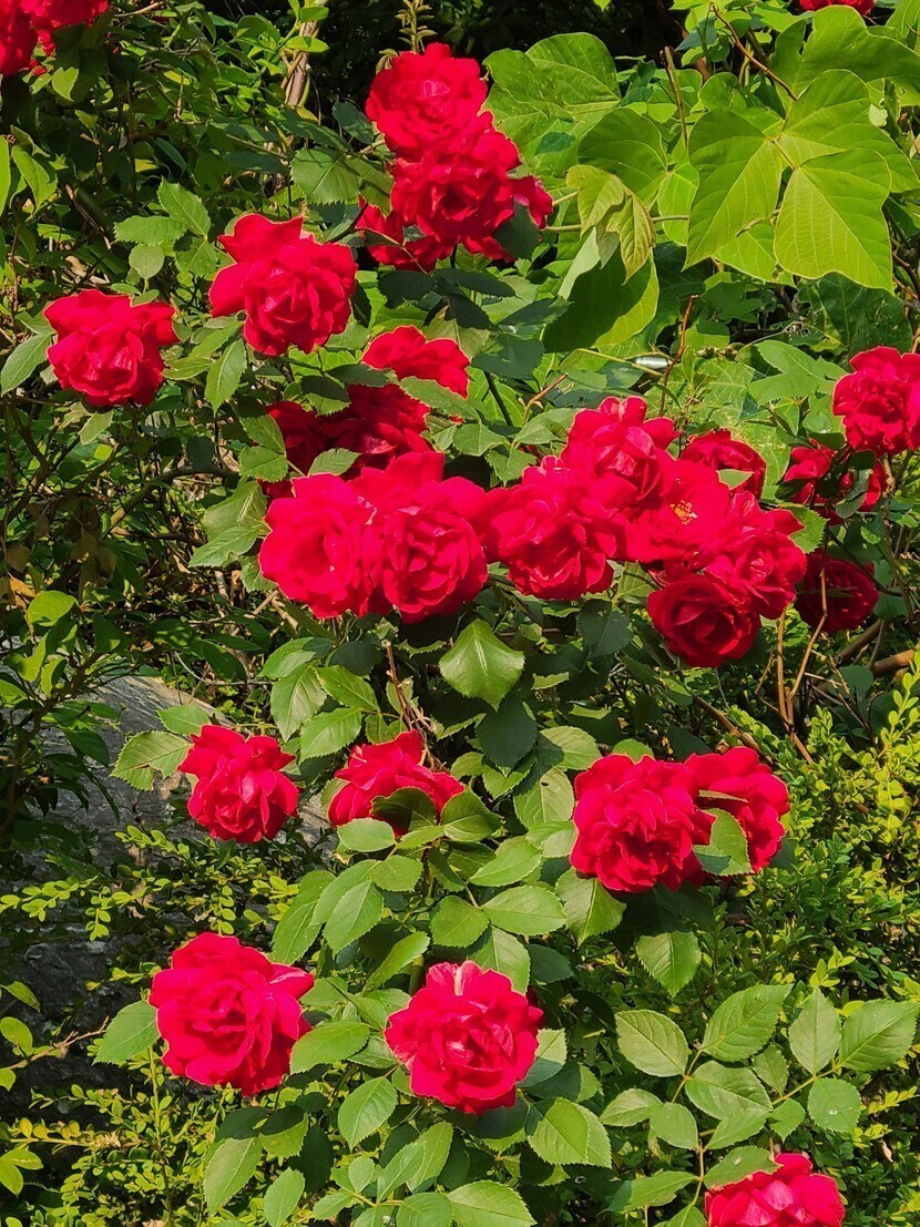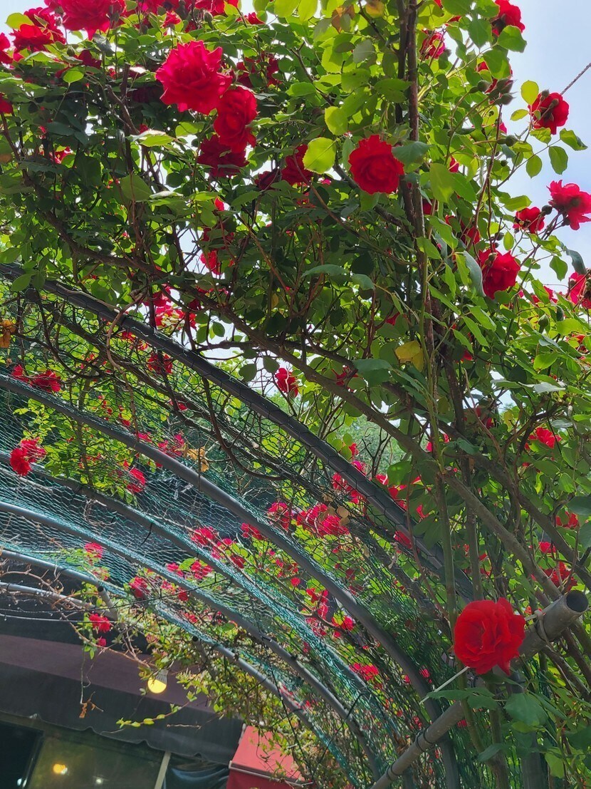 장미꽃들 보며 웃음 활짝