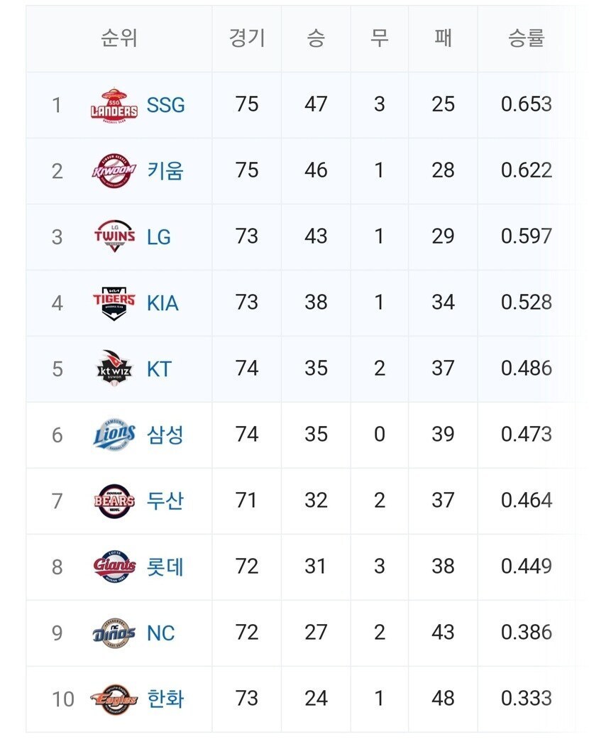 프로야구 현재까지 순위 알아볼게요 (22.06.29)