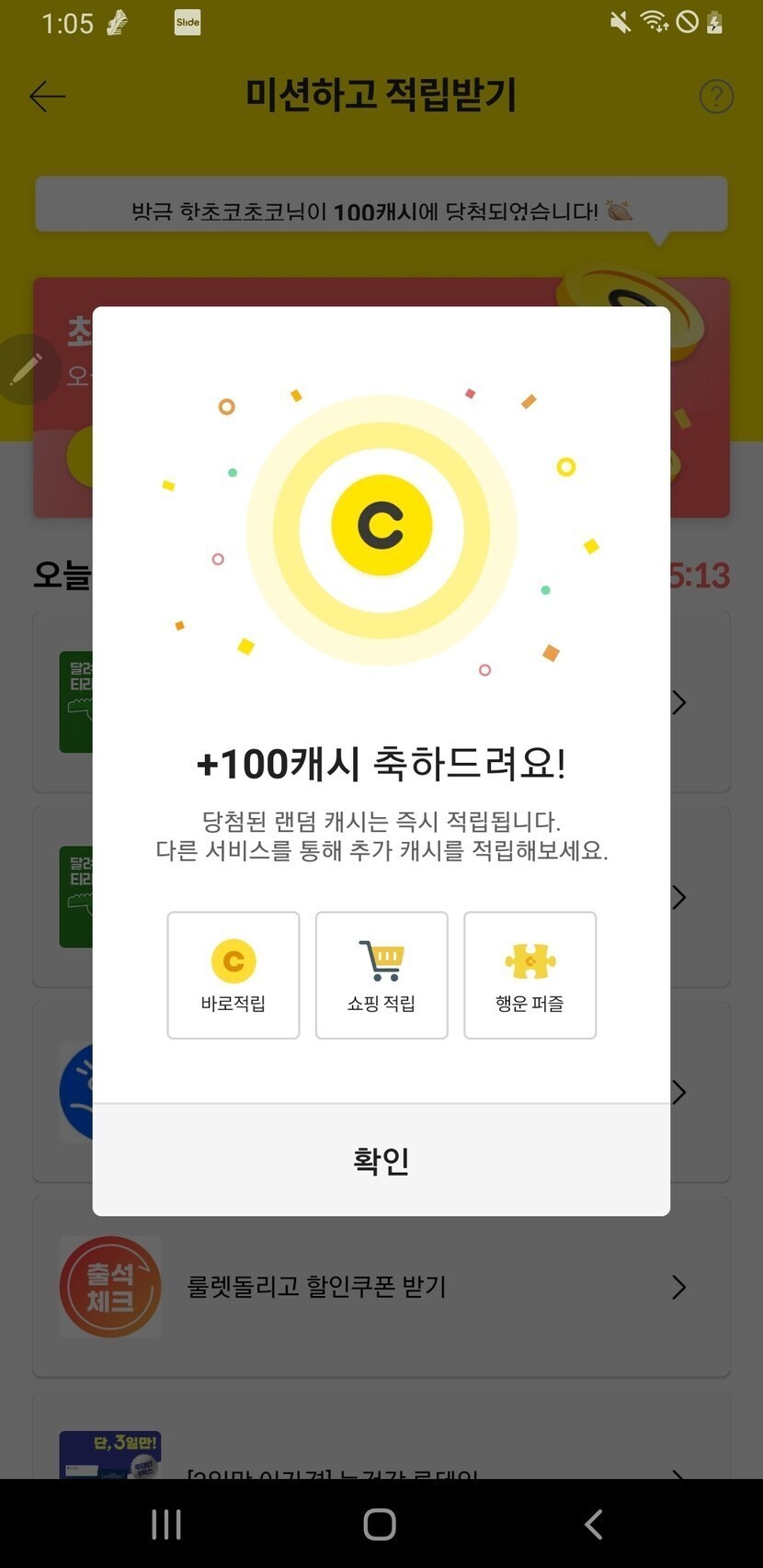 캐시슬라이드에서 100캐시 나와 좋아요 ㅋㅋ