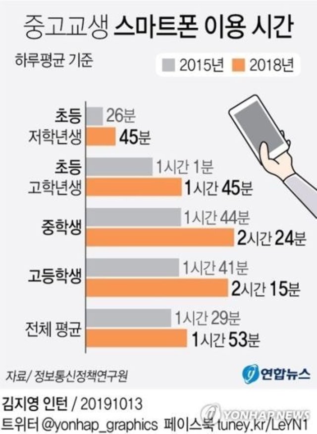 19.10.13 282 읽음 중고교생 하루평균 스마트폰 이용 시간 파파고마마고 구독하기 0 1 콘텐츠의 수익 0 https://n.news.naver.com/article/001/0011139197 1 0 / 300 입력