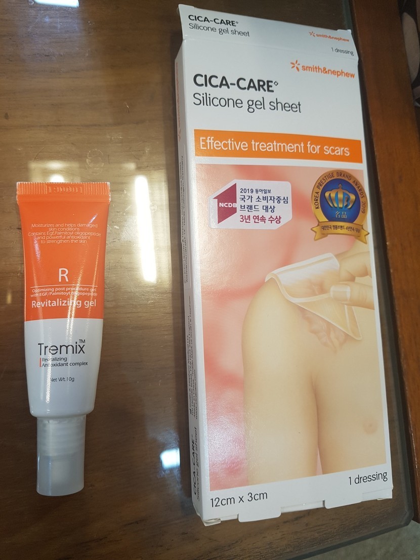 볼에 난 상처로 인해 흉이 생겨서 병원진료후에 구매한 두가지 피부 재생 상품들..주로 아침엔 젤타입의 트라믹스 크림을 수시로 덧바르고,저녁엔 겔타입의 시카케어를 상처 위에 붙이고 테이핑한다.. 시카케어는 상처로 인해 붉어진 피부와 켈로라이드성 흉터에 효과가 좋다고 한다.시카케어는 원하는크기로 잘라서 붙일수 있는 있으며 오염시 세척 가능한 제품으로, 나는 상처부위에 맞게 잘라서 비닐에 붙여서 수시로 갈아준다.효과는 아직 확실하지 않으나 초반 상처에 비해서는 정말 많이 나아짐..물론 성형외과에서 받은 prp시술과 원장님의 노력이 가장 컷다..ㅠㅠ