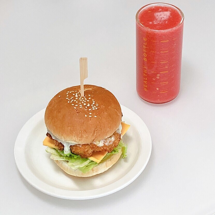 집에서 만든 새우버거랑 토마토주스