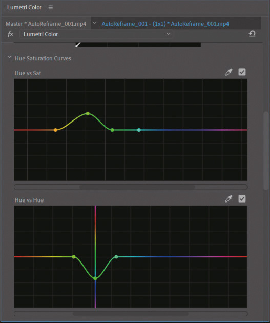 Lumetri Color 패널에서 Hue Saturation Curves 항목을 이용하면 색조 범위를 조정하며 자세한 색 보정 작업을 진행할 수 있습니다. 색조 범위는 스포이트 아이콘을 클릭한 다음 Monitor 패널에서 추출하거나 컬러 바를 클릭해 지정할 수 있습니다. 설정된 컬러 범위를 삭제하려면 CTRL을 누른 다음 클릭합니다.
