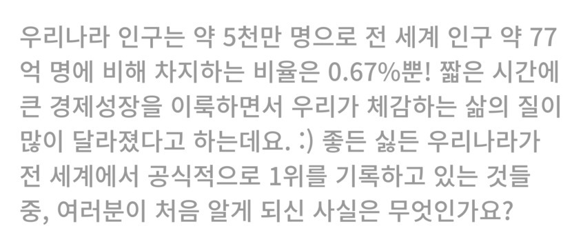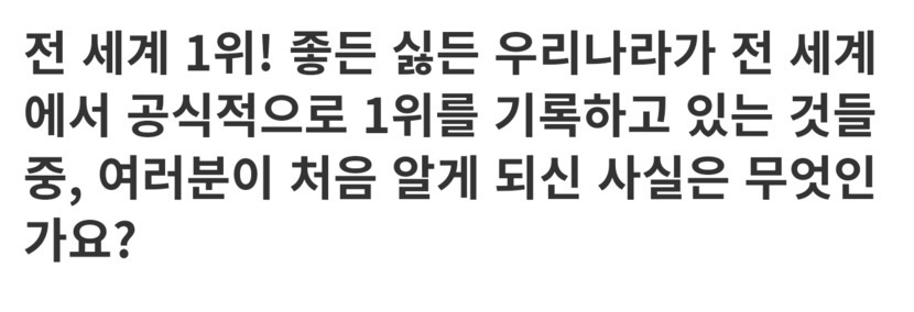전세계에서 대한민국이 1위인 것들 모음 ... 자랑스러운 것과 부끄러운것 그리고 의와인것들이 .... 또 알성달성한것도 있어요...