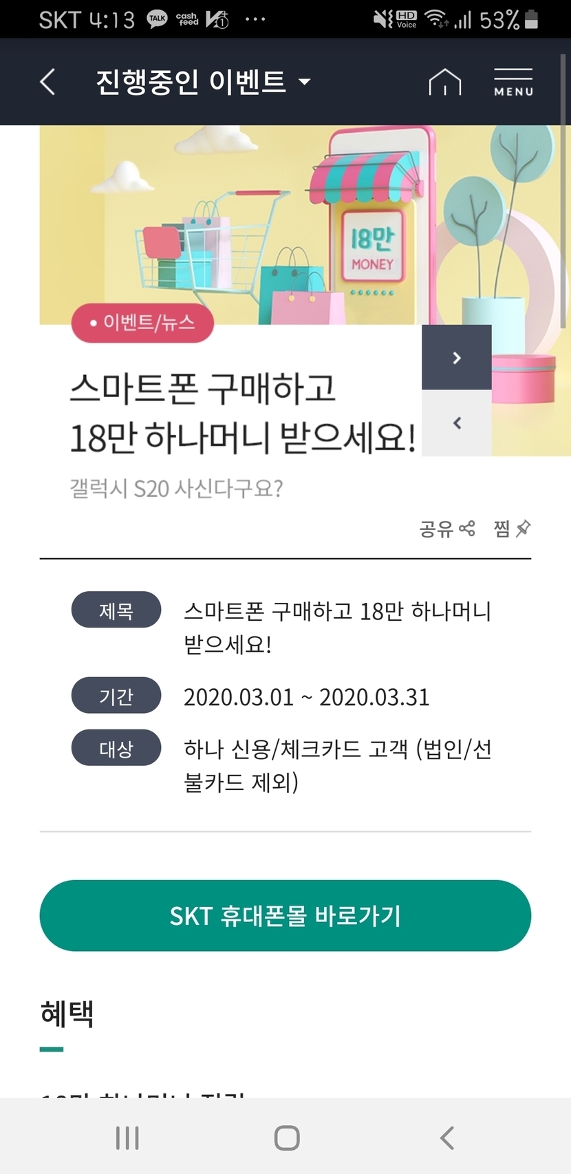 카드사용 잘만하면 정말 꿀혜택이 많이있네요. 다른통신사도 카드사마다 이벤트나 꿀혜택 있으니까 꼼꼼히 따져보시고 핸폰구매하셨음 좋겠네요~