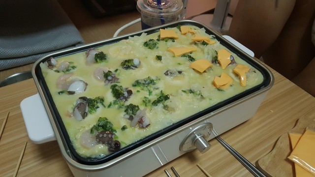 한쪽은 치즈+새우넣고 한쪽은 문어넣고 기다림