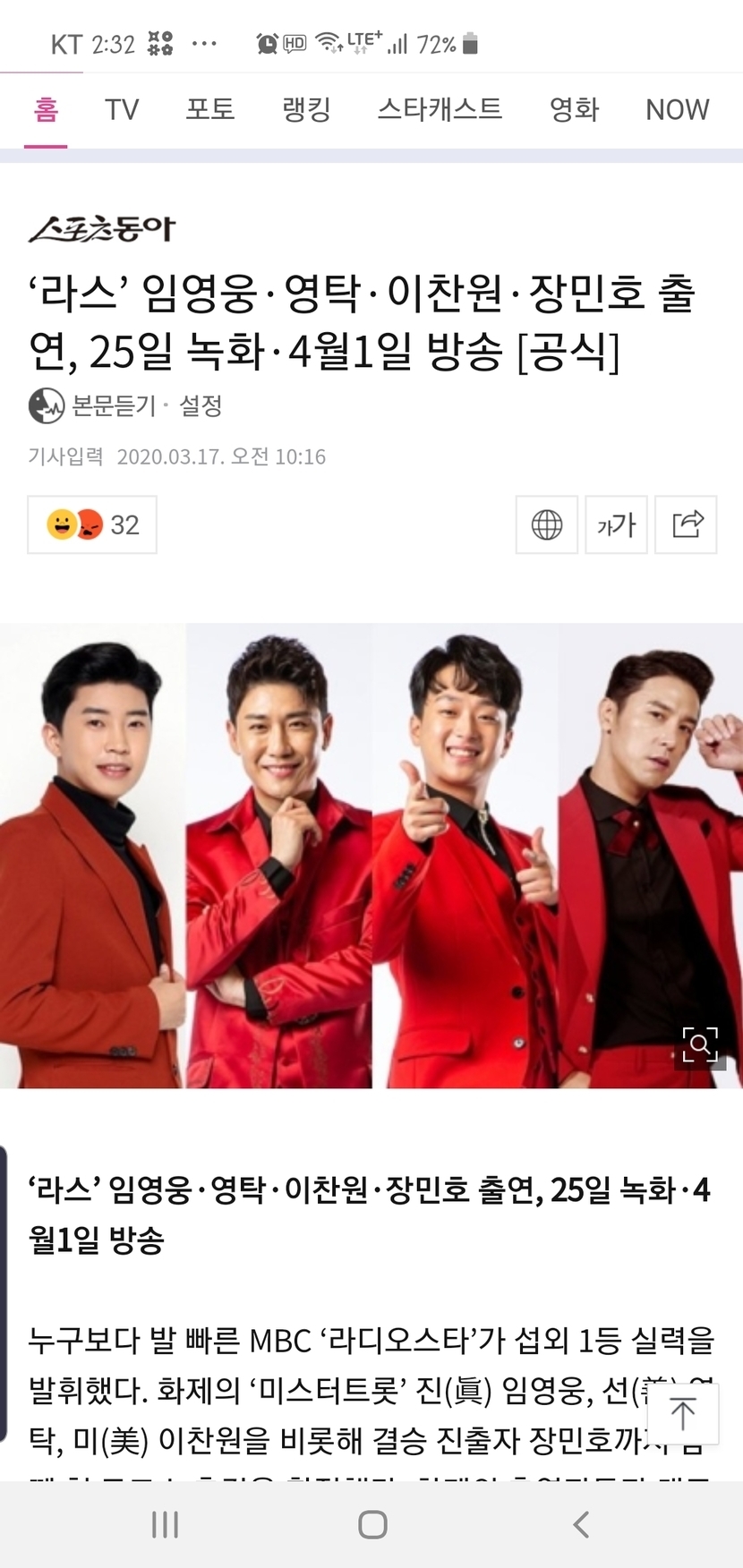 20.03.17 202 읽음 ☆미스터트롯☆ 라디오스타 출연~ shine1109 구독하기 0 8 콘텐츠의 수익 27 라디오스타에 나온다네요~방송일 4월 1일이라니 참고하세요~ 8 0 / 300 입력