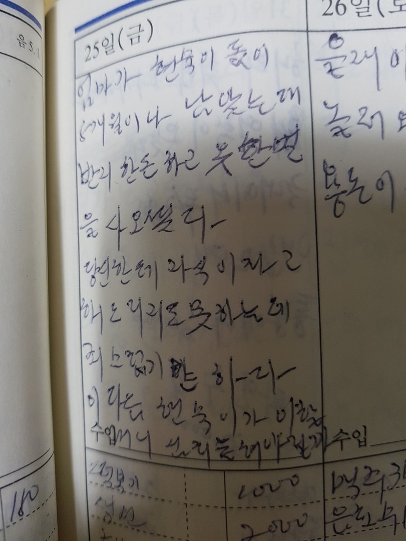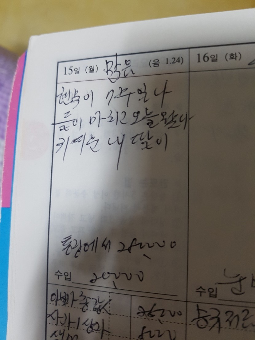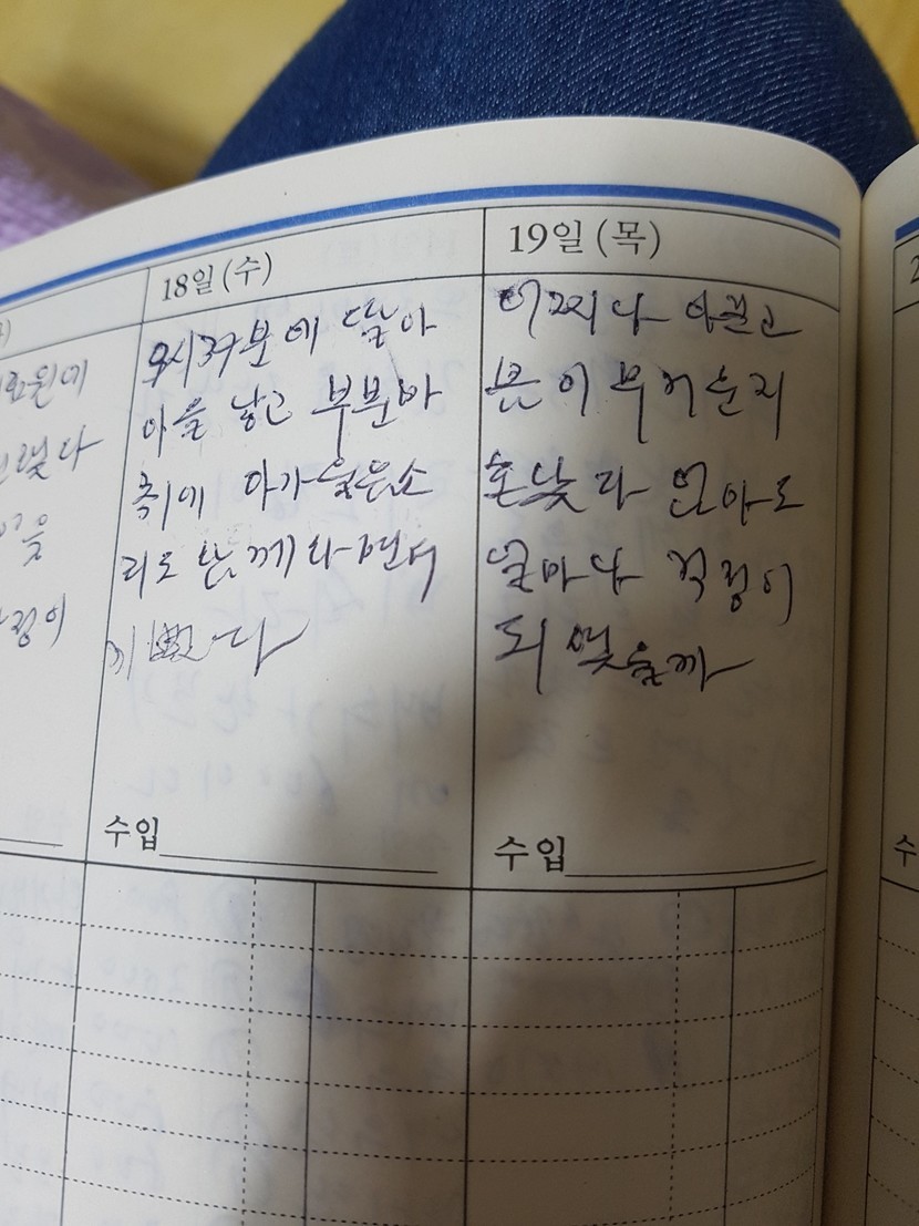 20.03.17 309 읽음 엄마의 가계부 일기 쿤랑에타 구독하기 1 24 콘텐츠의 수익 27 제가 태어난 날 쓰신 일기에요 어렸을때는 엄마의 마냥 귀여운 딸이었는데ㅋㅋㅋ죄송스럽네요ㅎㅎ 24 0 / 300 입력