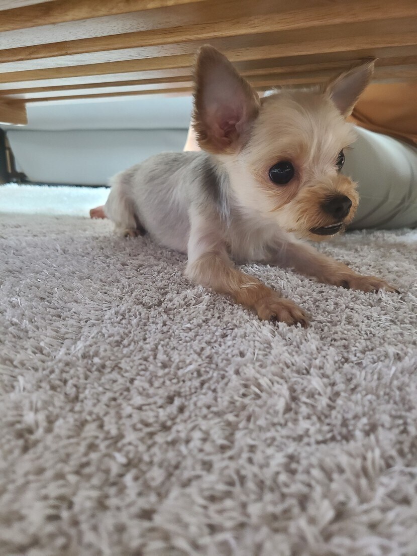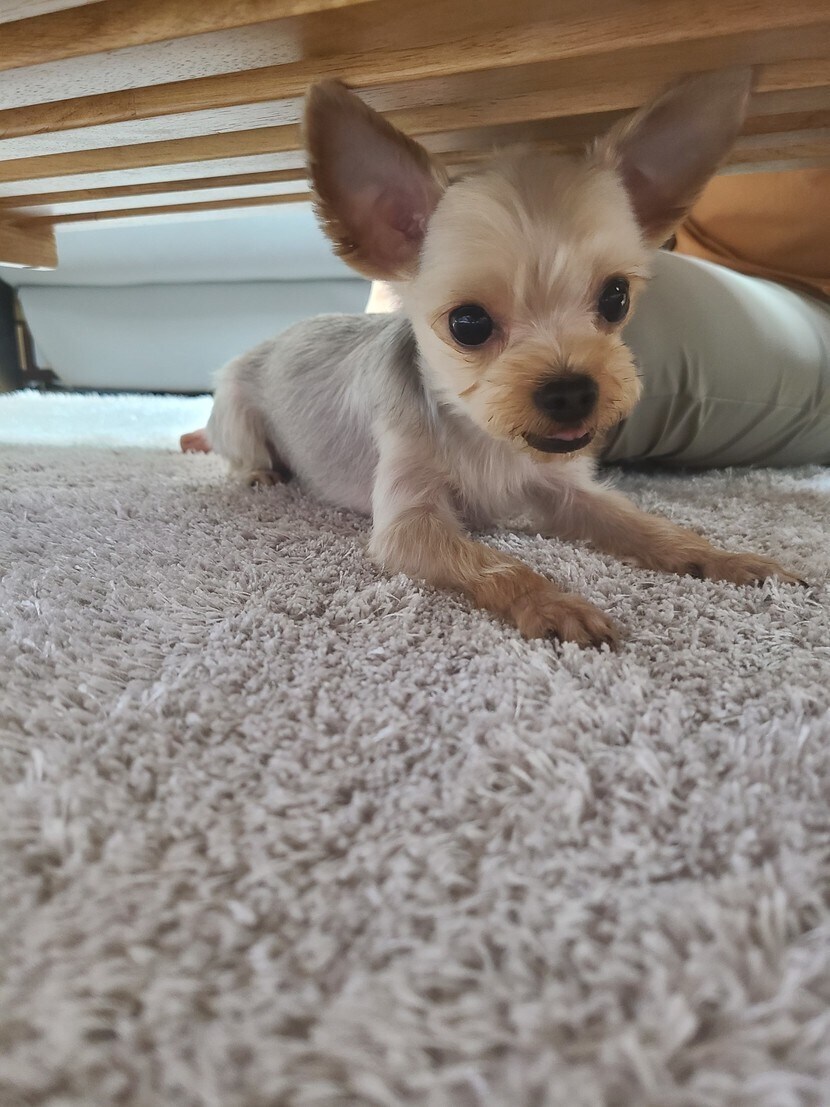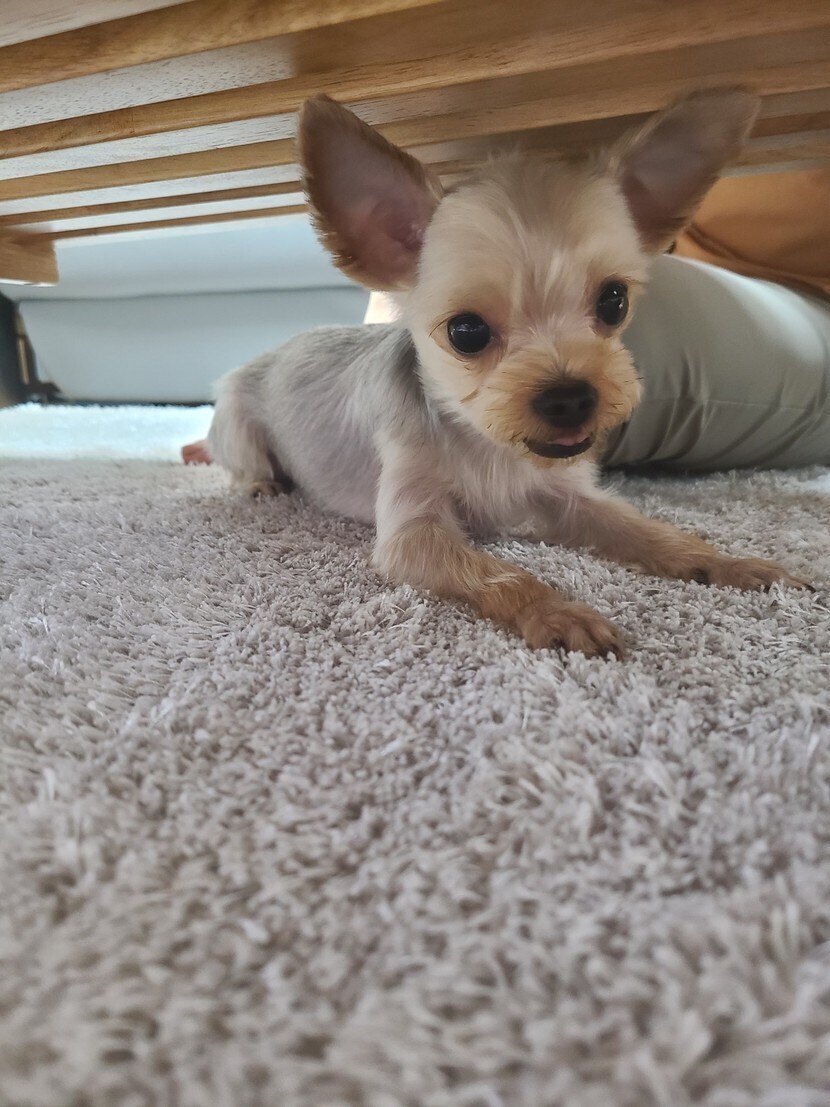 상밑에 들어간 강아지
