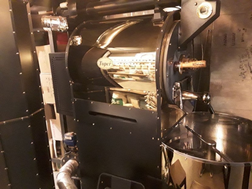 10여평의 규모의 매장에 생두 자루와 큰 로스팅기가