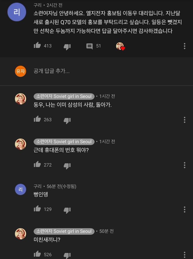 삼성 광고 받은 오늘자 소련여자 유튜브 영상에 달린 댓글.jpg