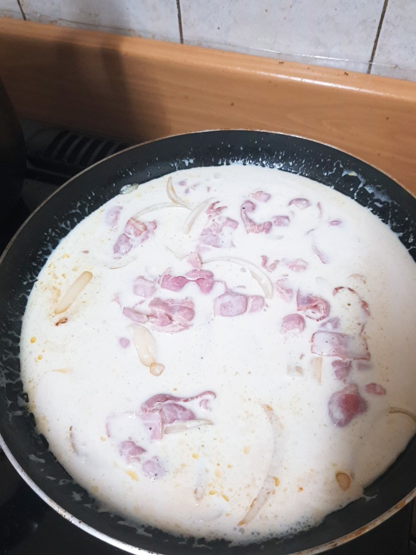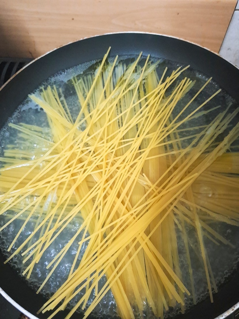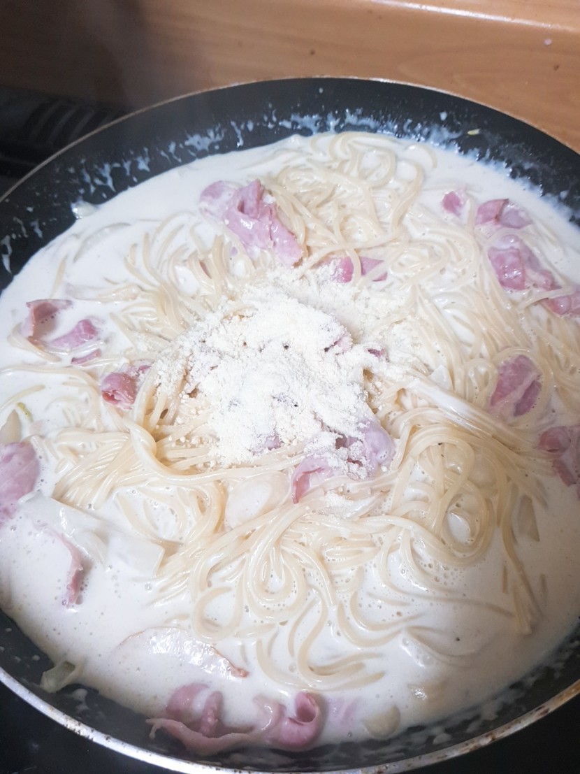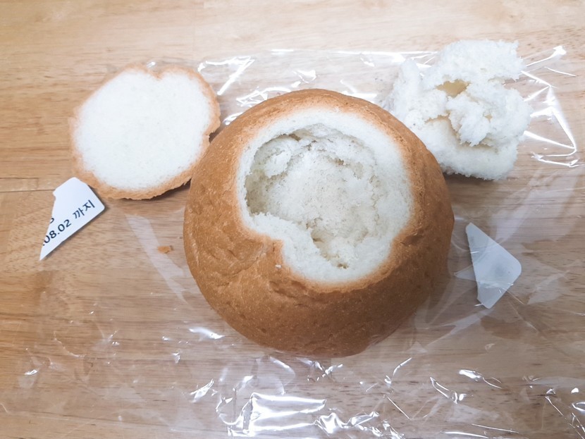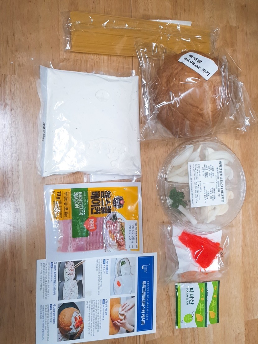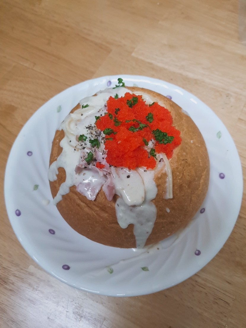 재료는 이렇게 있고요안에 크림파스타를 넣어줄거니까 빵 윗부분을 잘라주고 안에를 파줍니다파스타면을 8~10분 정도 삶아줘요 그동안 재료들을 손질해주고 올리브유에 채소들을 볶아줘요양파가 약간 노르스름 해질때까지 볶아주면 크림소스를 부어서 섞어줍니다그리고 삶아뒀던 면을 넣고 섞어주다가 불을 끄고 파마산 치즈가루를 넣고 다시 섞어줍니다마지막으로 속을 파둔 빵안에 파스타를 넣어주고 위에 날치알이랑 파슬리를 뿌려주면 완성!!!