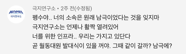 19.10.28 170 읽음 펭수를 고향으로 데려가려는 극지연구소.jpg 타래과레시피 구독하기 0 0 콘텐츠의 수익 0 펭수를 위한 극지연구소의 인프라....펭수 남극길만 걸어....★ 0 0 / 300 입력
