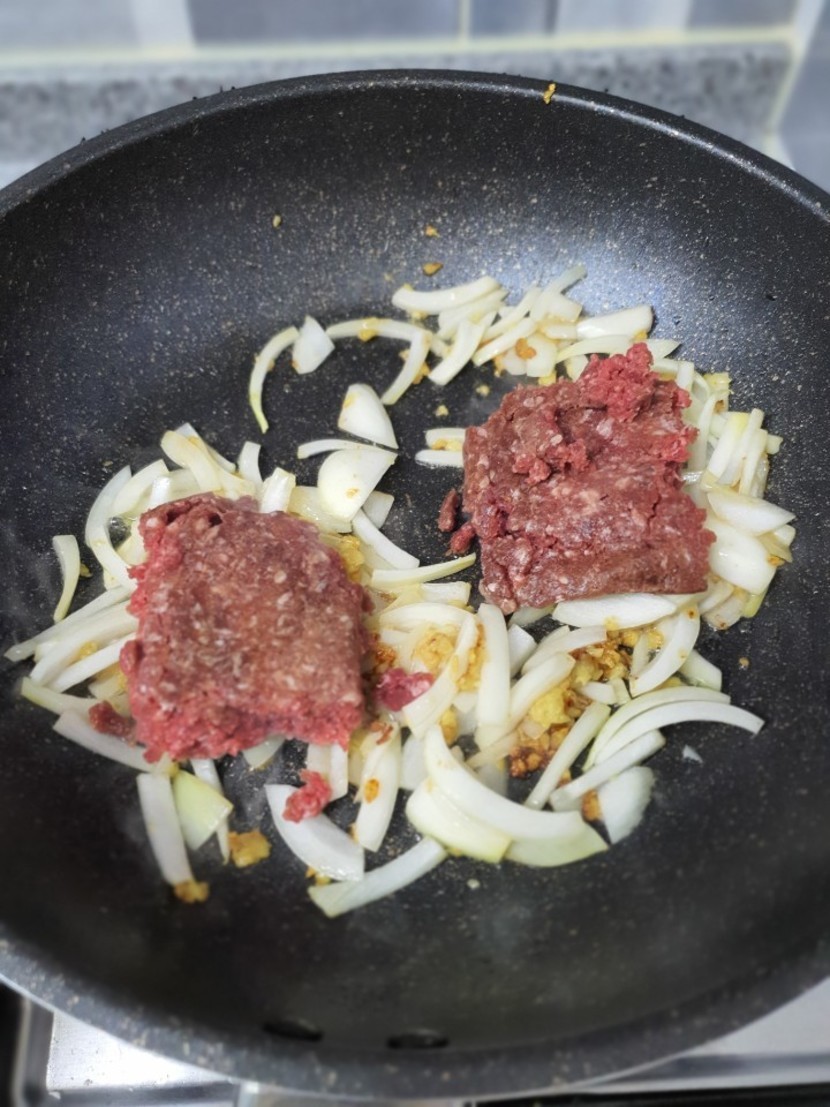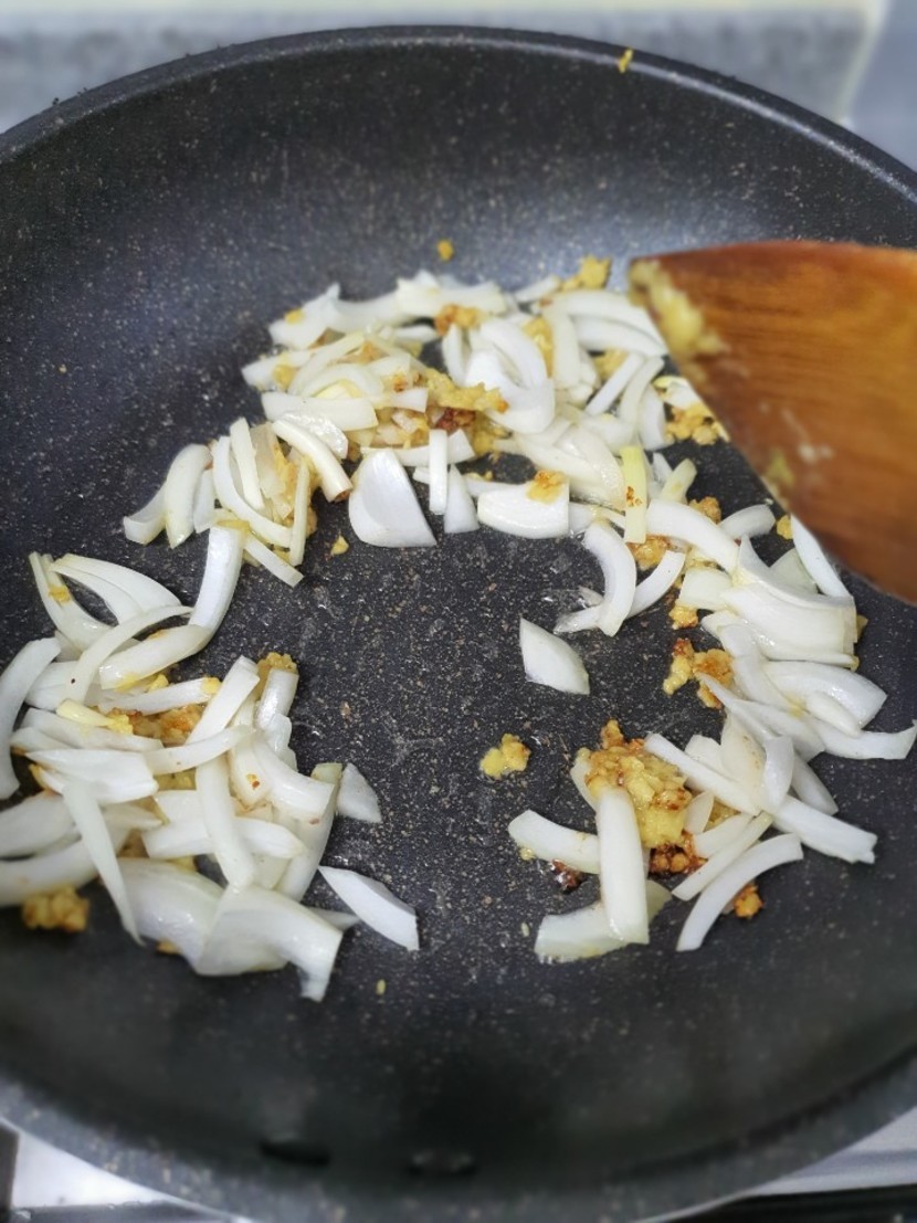 오일에 마늘볶고 양파볶고 고기 볶아 주세요