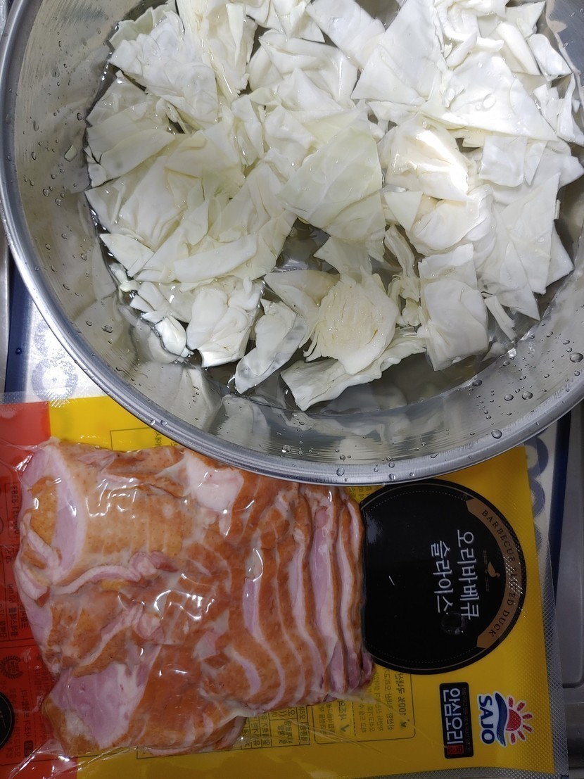 주 재료인 양배추와 훈제오리, 저는 파 썰어둔게 있어서 파만 넣었고 이외에도 양파나 마늘 당근 양파 등등 입맛대로 여러가지 넣어주세요~