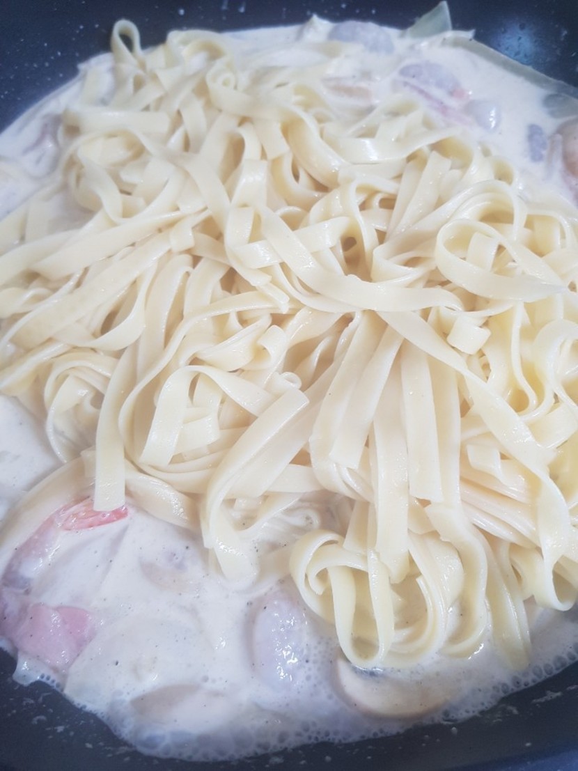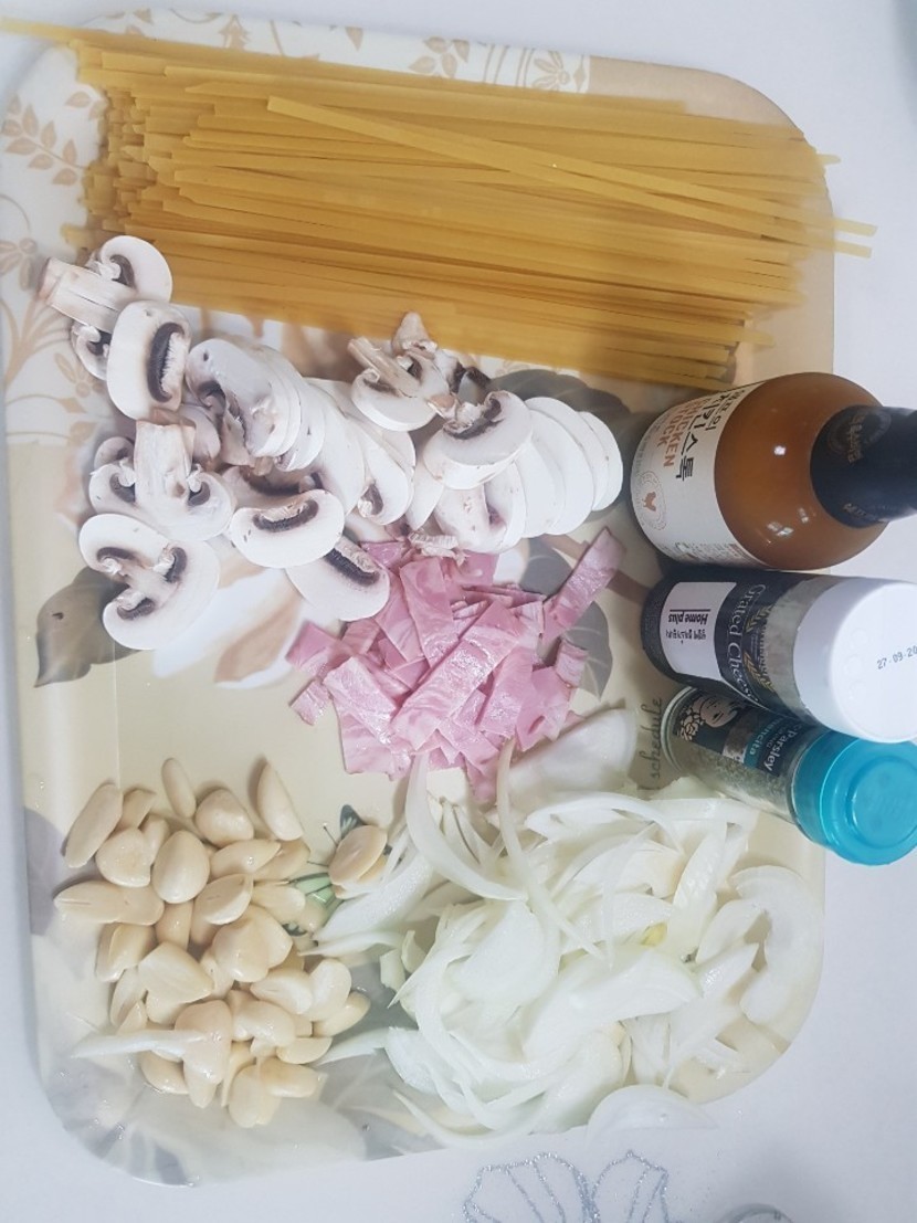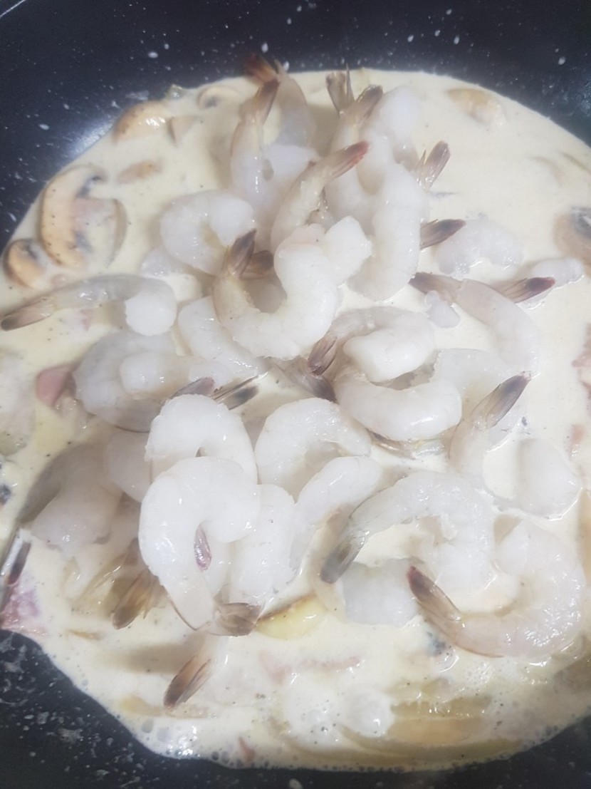 베이컨,새우,마늘(반 자르기),후추,파마산치즈 많이