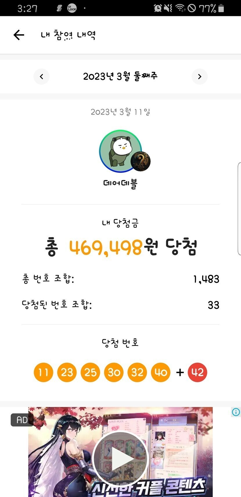 23.03.12 101 읽음 1등 데어데블 구독하기 2 7 콘텐츠의 수익 3 슈퍼로찌라는 무료로또 어플인데매주 80원에서 300원까지 정도만 당청 되더니오늘 1등에 당청 됐네요실제 로또에 비하면 별거 아니지만 기분은 좋네요 7 0 / 300 입력