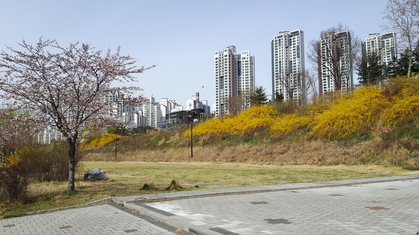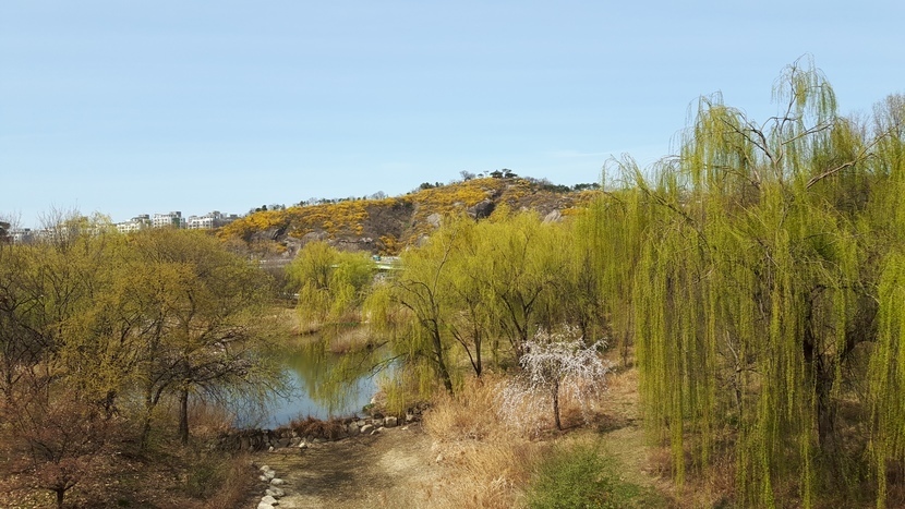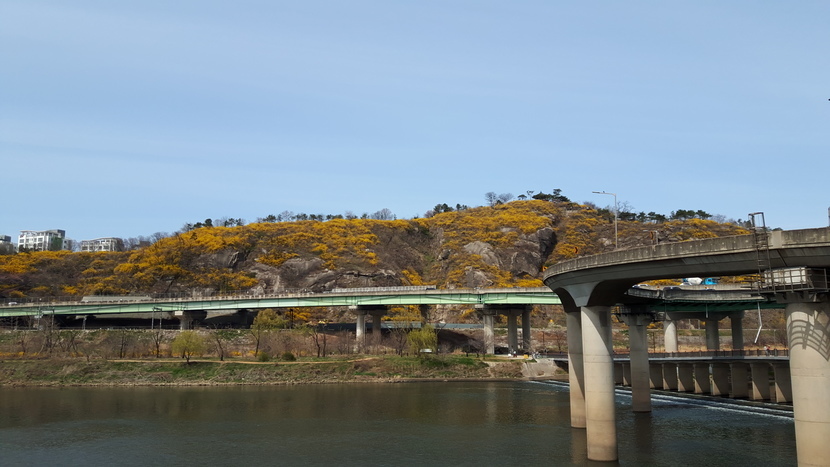 저 멀리 보이는 응봉상에는 개나리가 산 전체를 덮고 있습니다