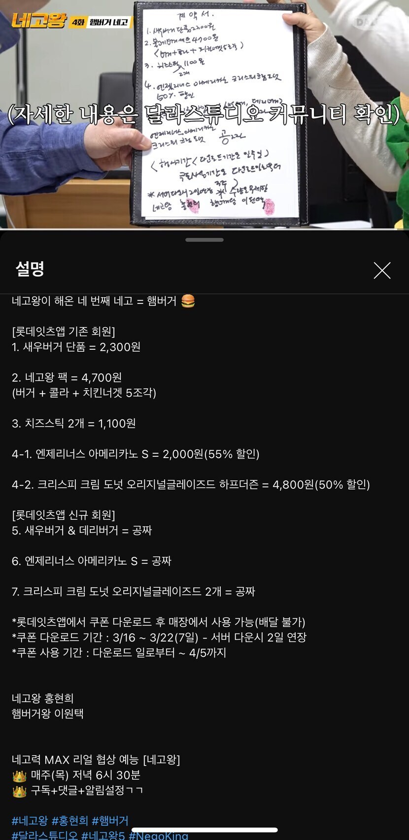 23.03.16 125 읽음 네고왕 - 롯데리아편 일상소녀😋(답방) 구독하기 16 17 콘텐츠의 수익 1 유튜브에 <네고왕> 이라는 채널이 있는데오늘 네고왕에서 롯데리아 네고를 한 영상이 올라와서 봤어요!보고 친구한테도 알려줘서 처음에는 5천명이 대기 중이었는데한 30분 전에 다시 들어가보니까 1만명이 대기 중이더라구요..또 기다리느라 힘들었습니다 ㅋㅋㅋㅋㅋㅋㅋㅋㅋ네고는 이렇게 되어있구쿠폰함에서 다운할 수 있는 거 다 다운했더니내 쿠폰함에 있는 쿠폰이 21개나 되네요 ㅋㅋㅋㅋㅋㅋㅋㅋㅋ 17 0 / 300 입력