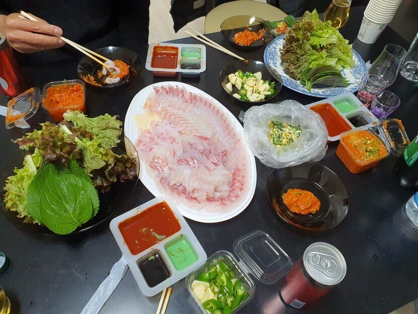 통영에서 시외버스 짐칸타고 온 싱싱한 회!!!
