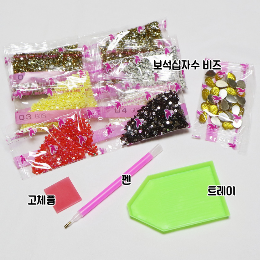 보석십자수 비즈, 고체풀, 펜, 트레이가 있어요.