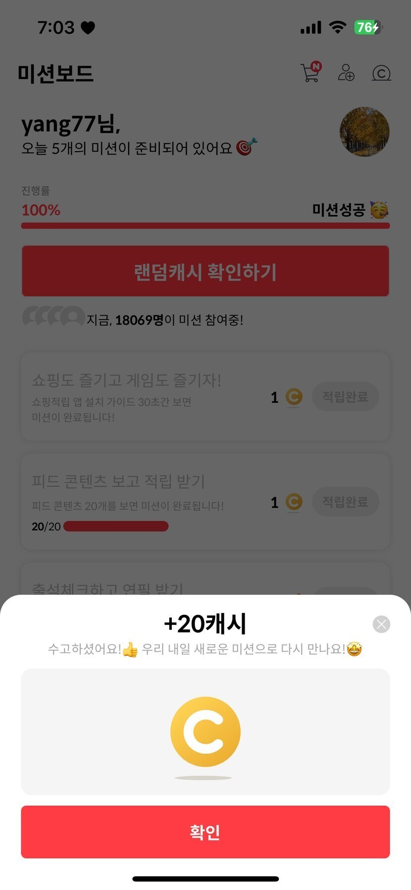 23.04.24 195 읽음 힘내라고 ㅎㅎ yang77 구독하기 11 9 콘텐츠의 수익 4 새벽에 잠이 깨면서 하루가 피곤하네요늦은 미션으로 시작하는데 힘내라고 20캐시 주나봐요감사한 하루입니다 남은 시간도 화이팅하세요💖💖💖 9 0 / 300 입력